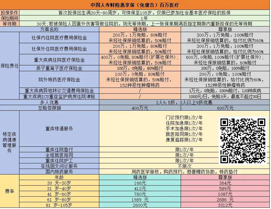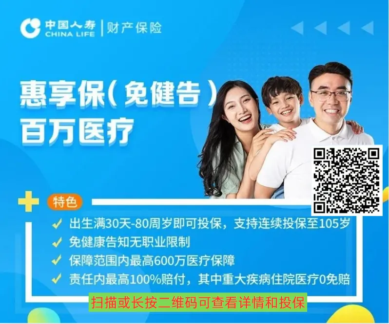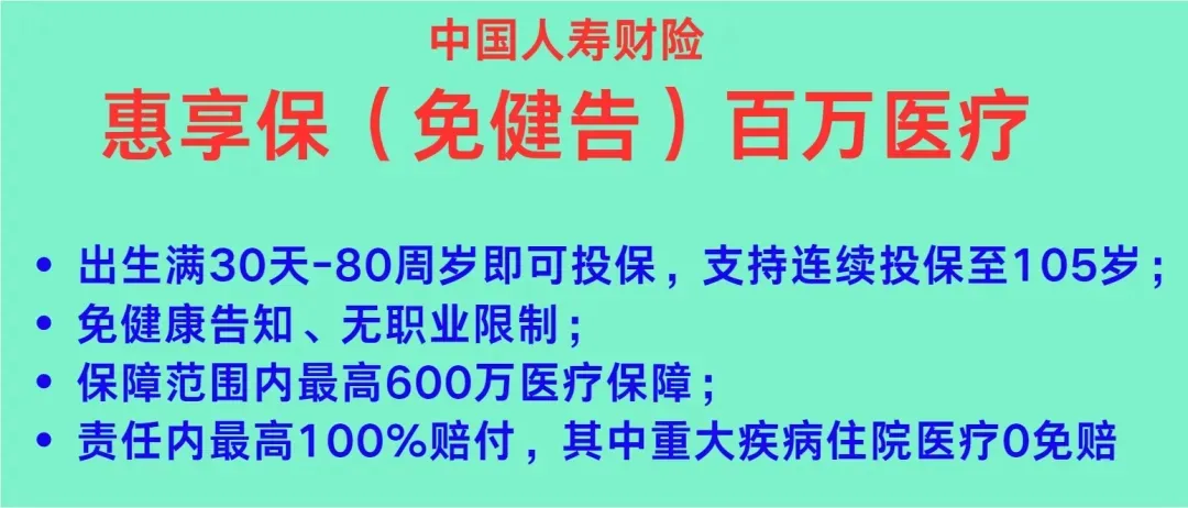 中国人寿财险惠享保(免健告)百万医疗,免健康告知、无职业限制;责任内最高100%赔付,其中重大疾病住院医疗0免赔