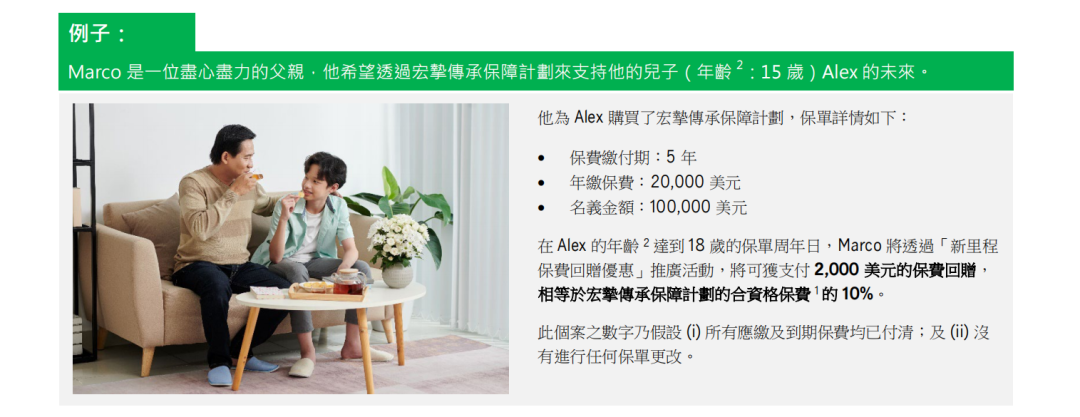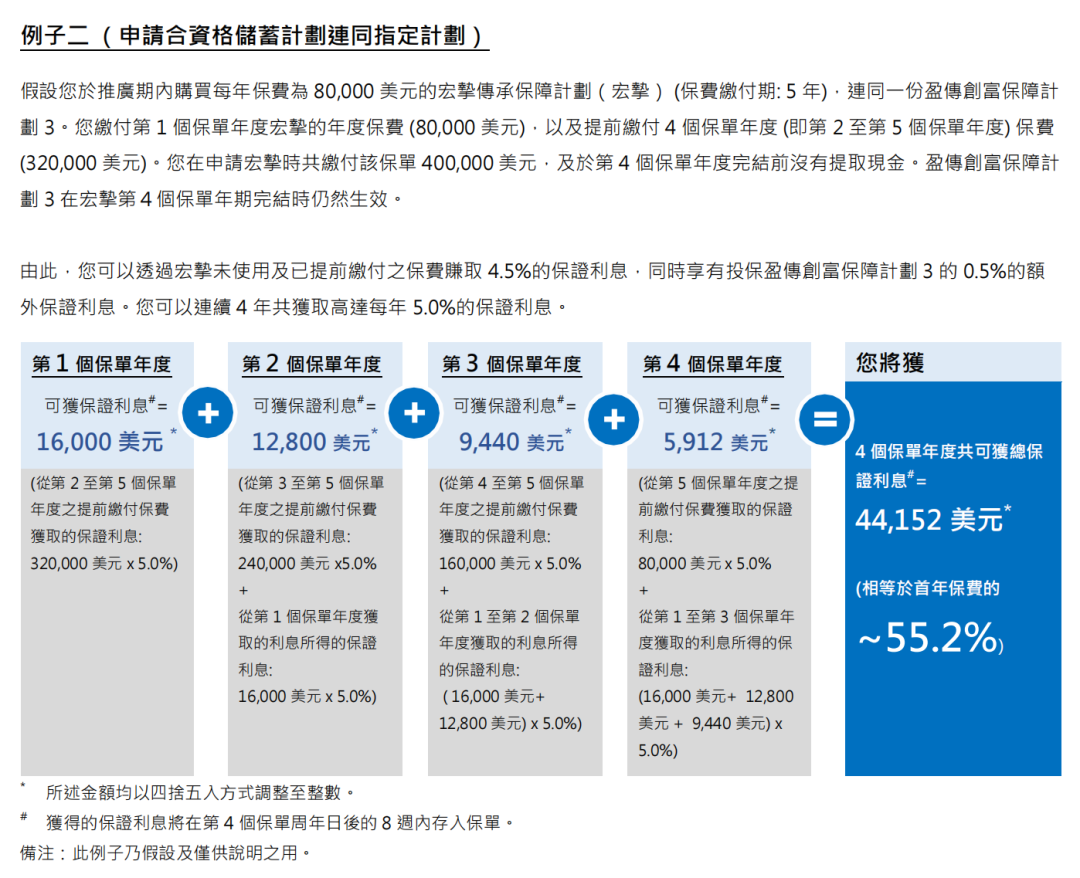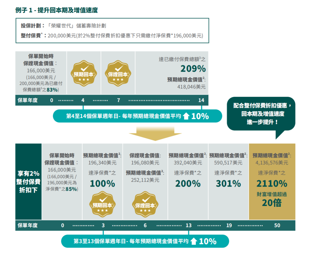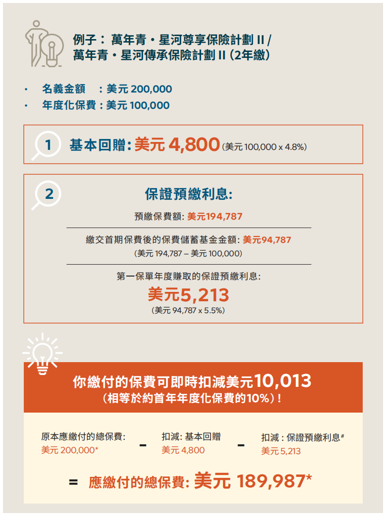 ▲ 额外优惠2:同一保单持有人成功投保「环宇盈活」(而该保单的年度化保费达5万美金或以上)增加2%保费回赠