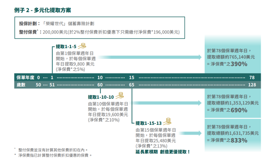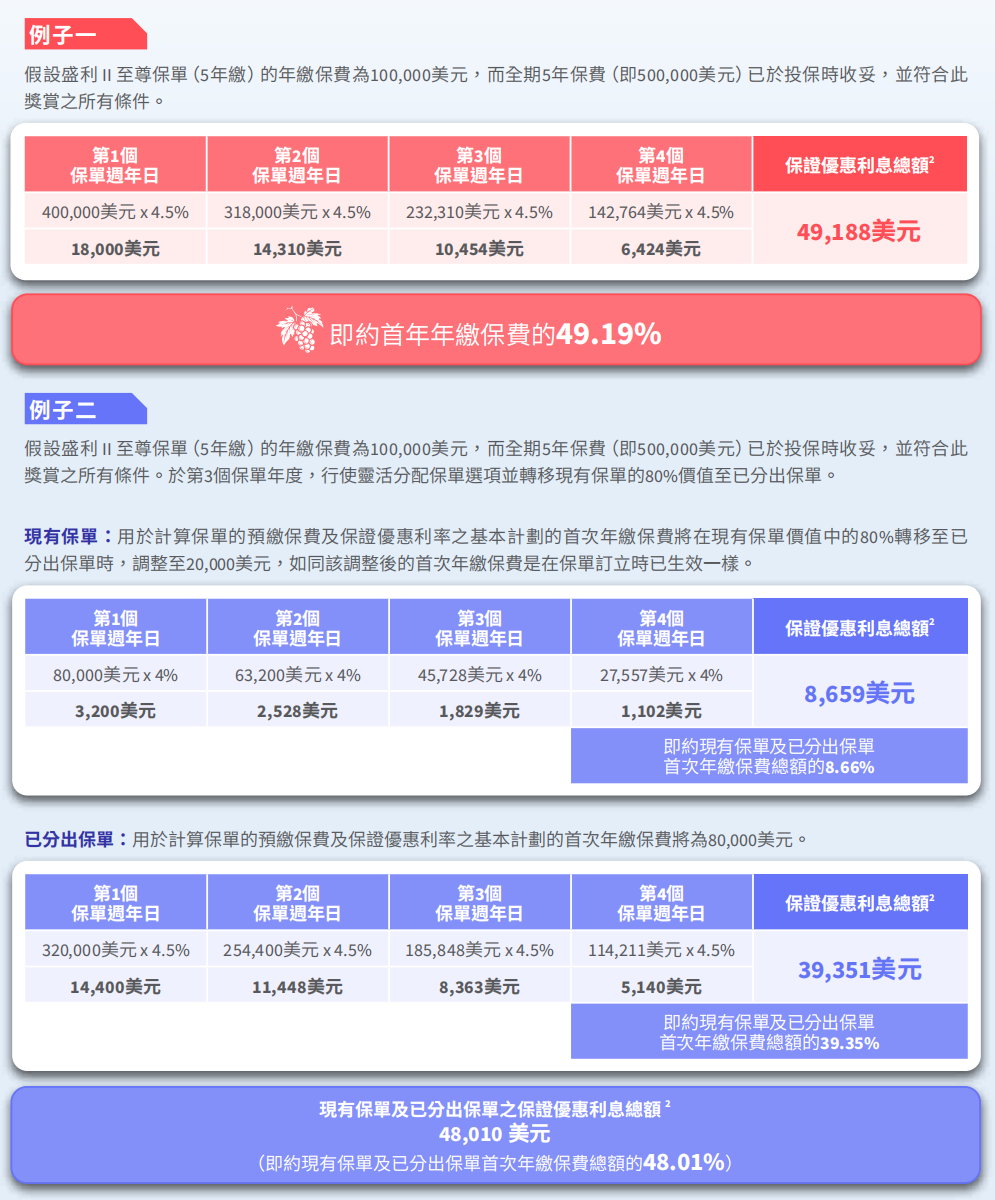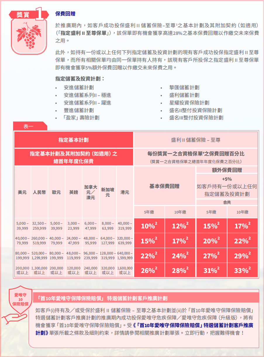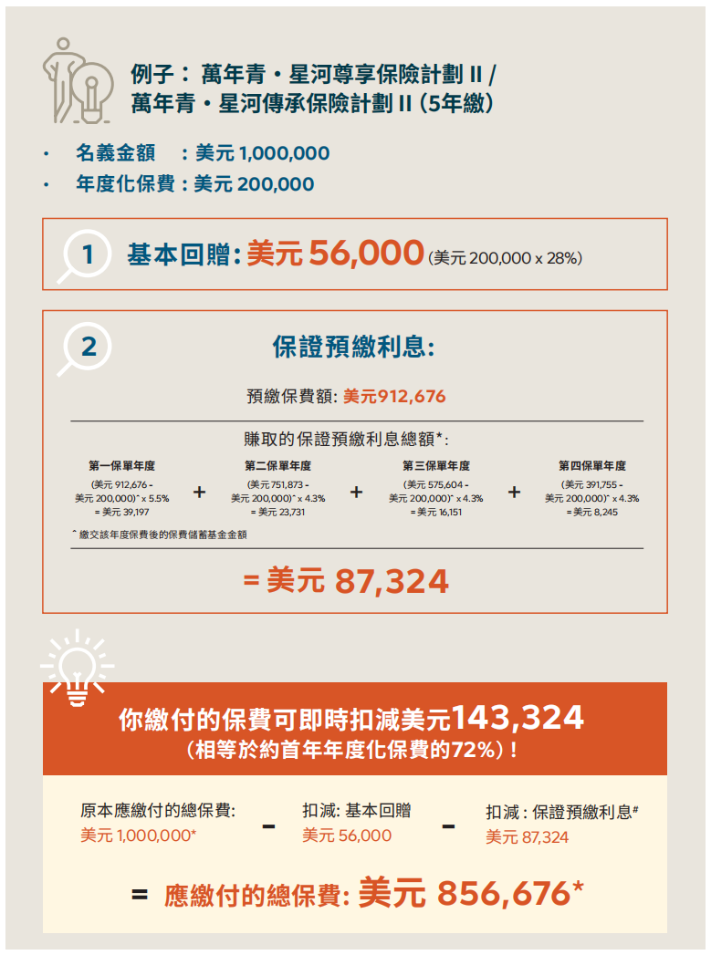 ▲ 额外优惠2:同一保单持有人成功投保「环宇盈活」(而该保单的年度化保费达5万美金或以上)增加2%保费回赠