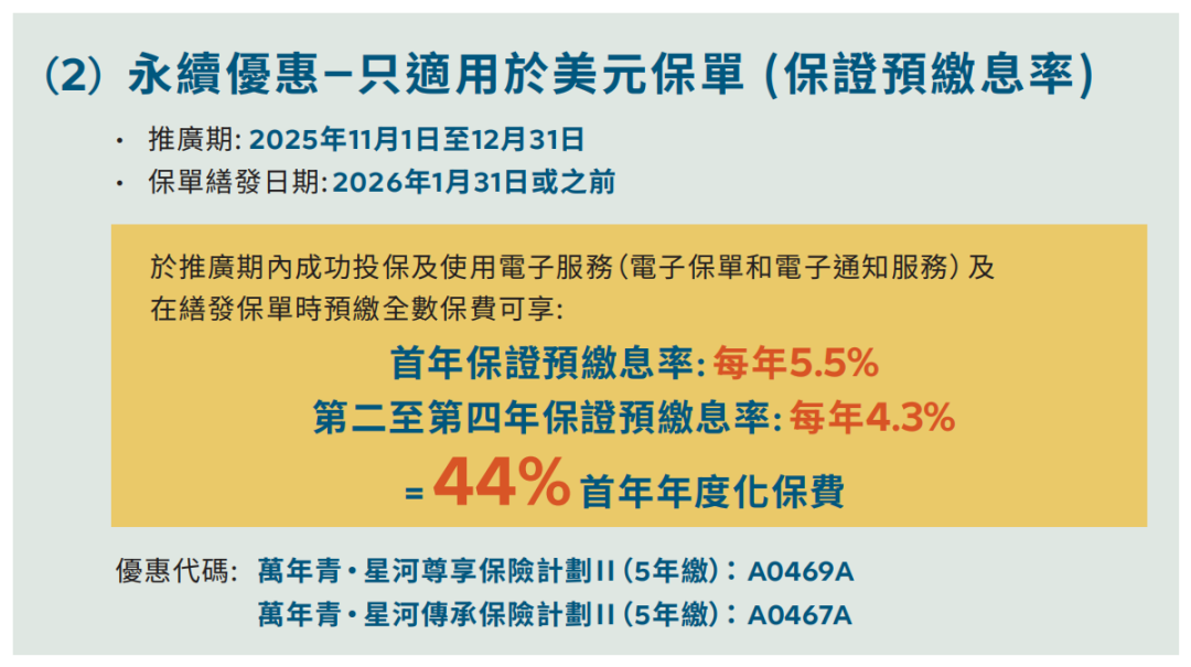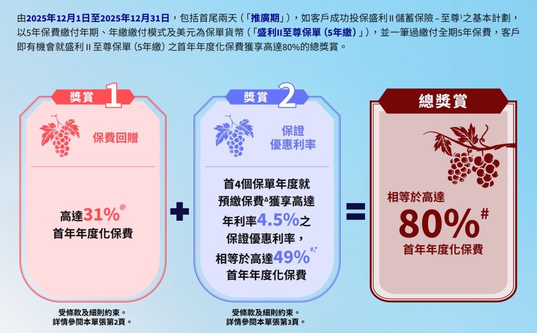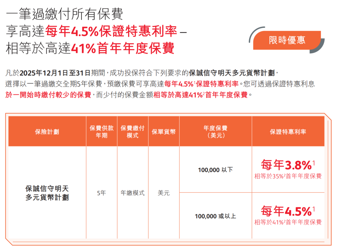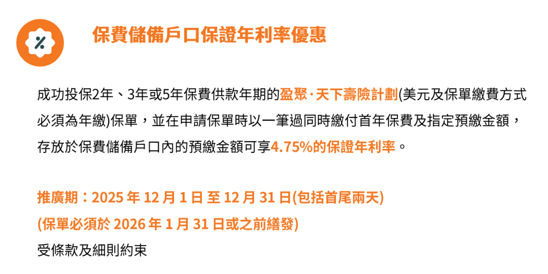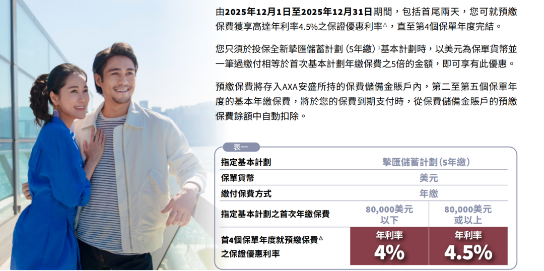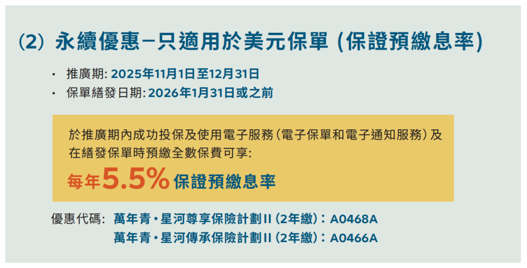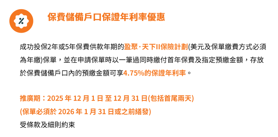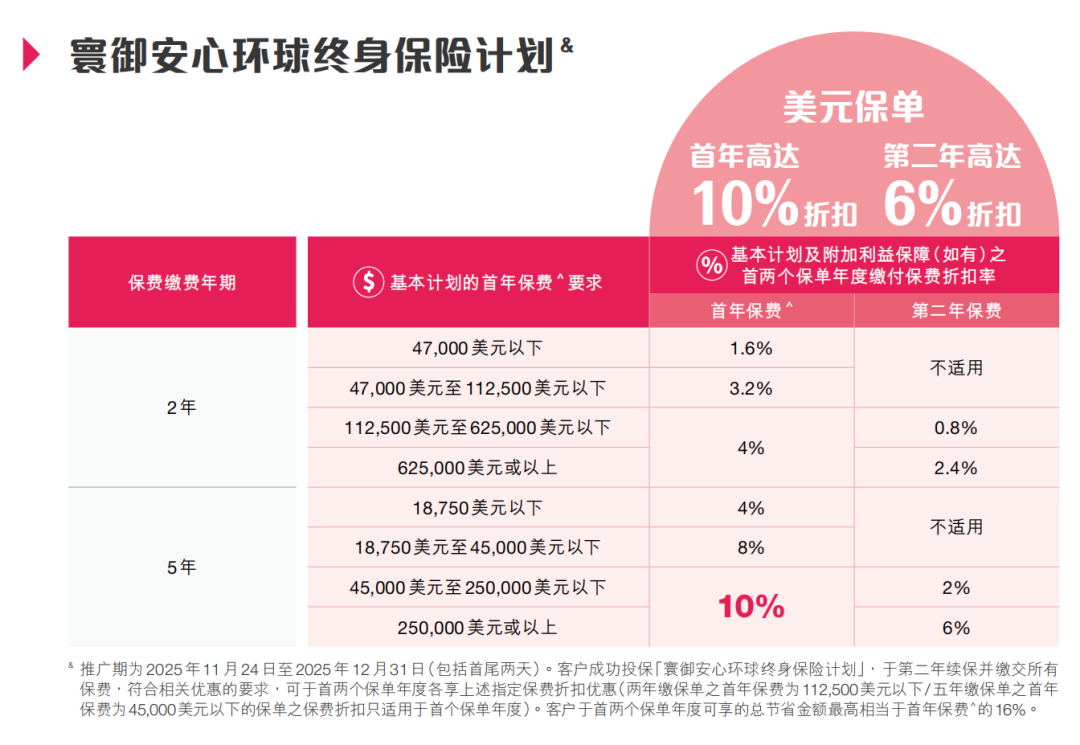 推广期:由2025年12月1日至12月31日(限5年缴美元保单)