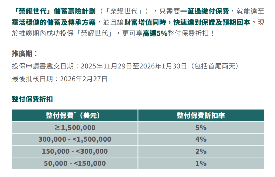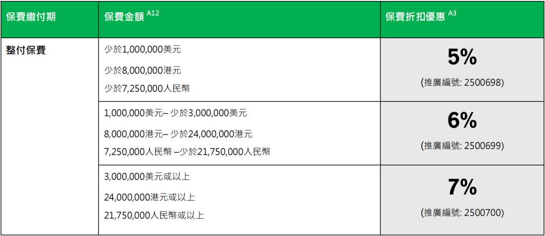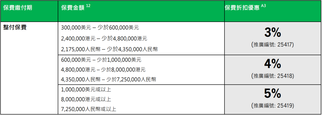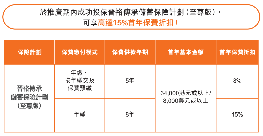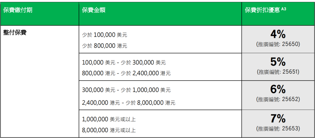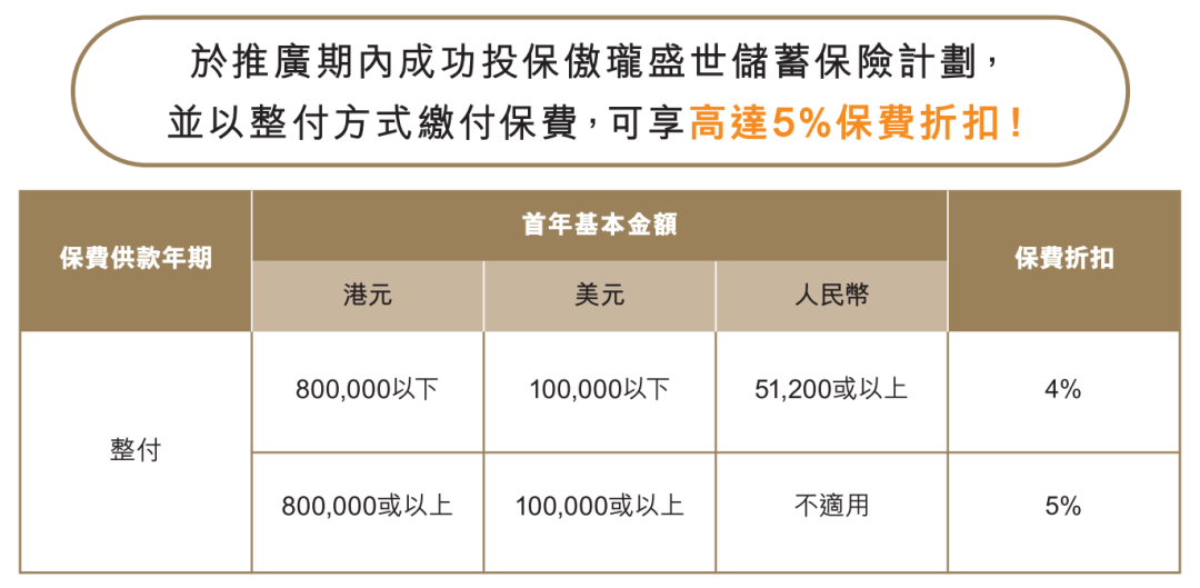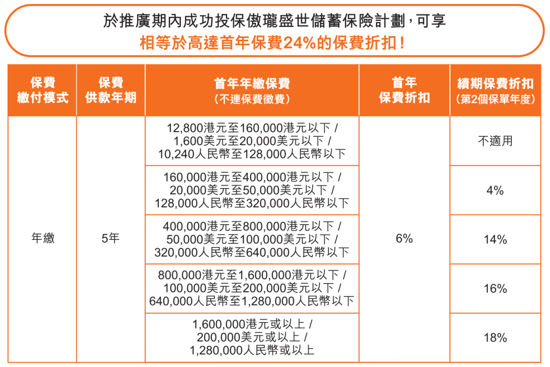 趸交:港币160万或以上/美金20万或以上享保费折扣8%