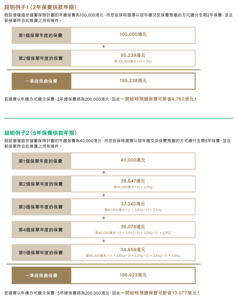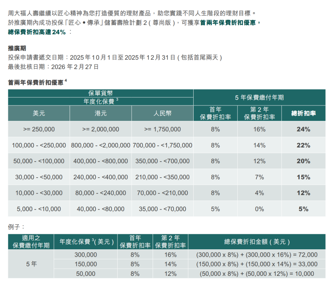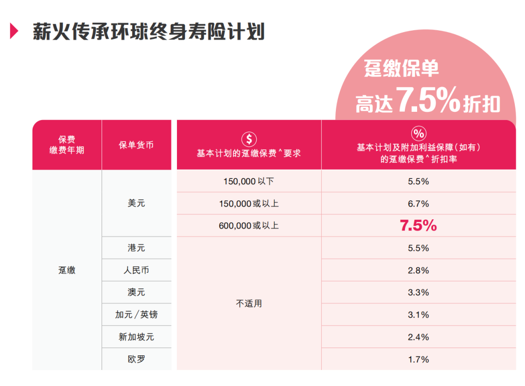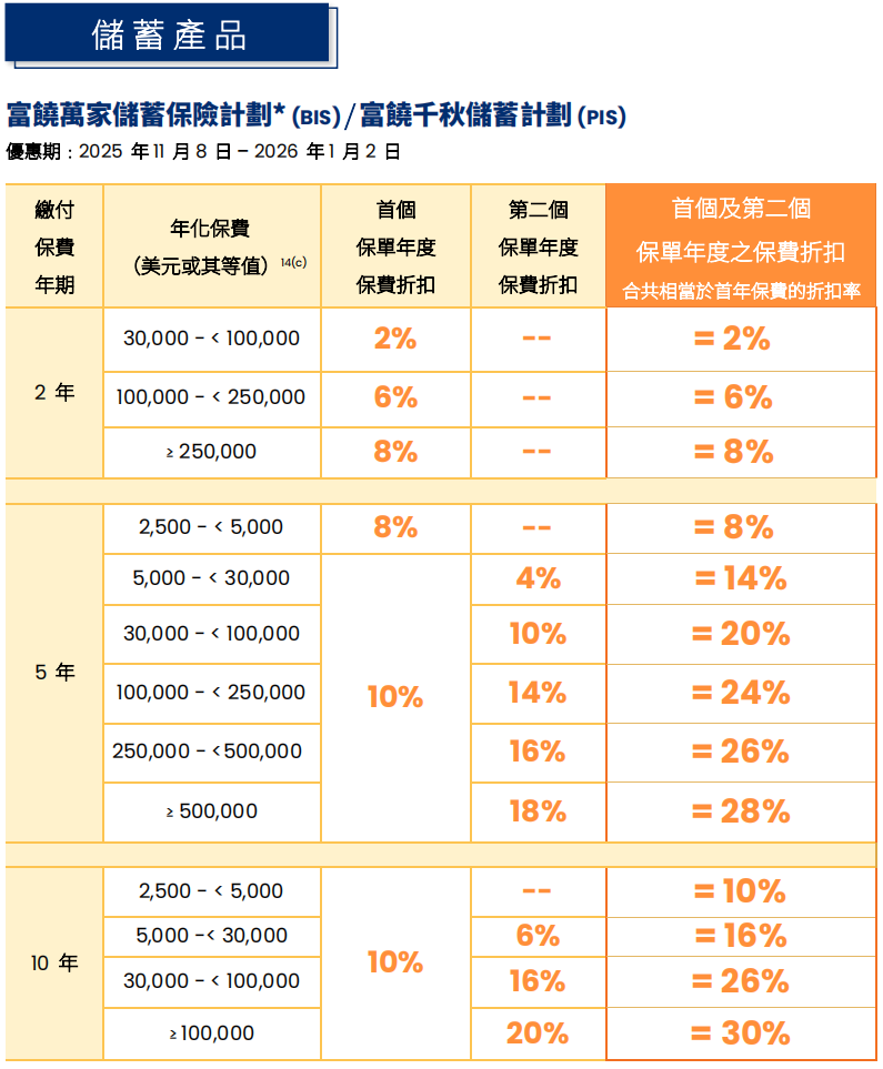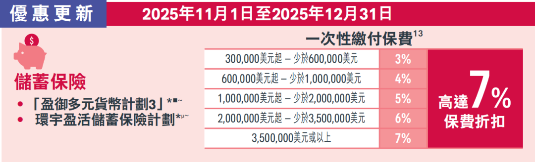 趸交:港币160万或以上/美金20万或以上享保费折扣8%