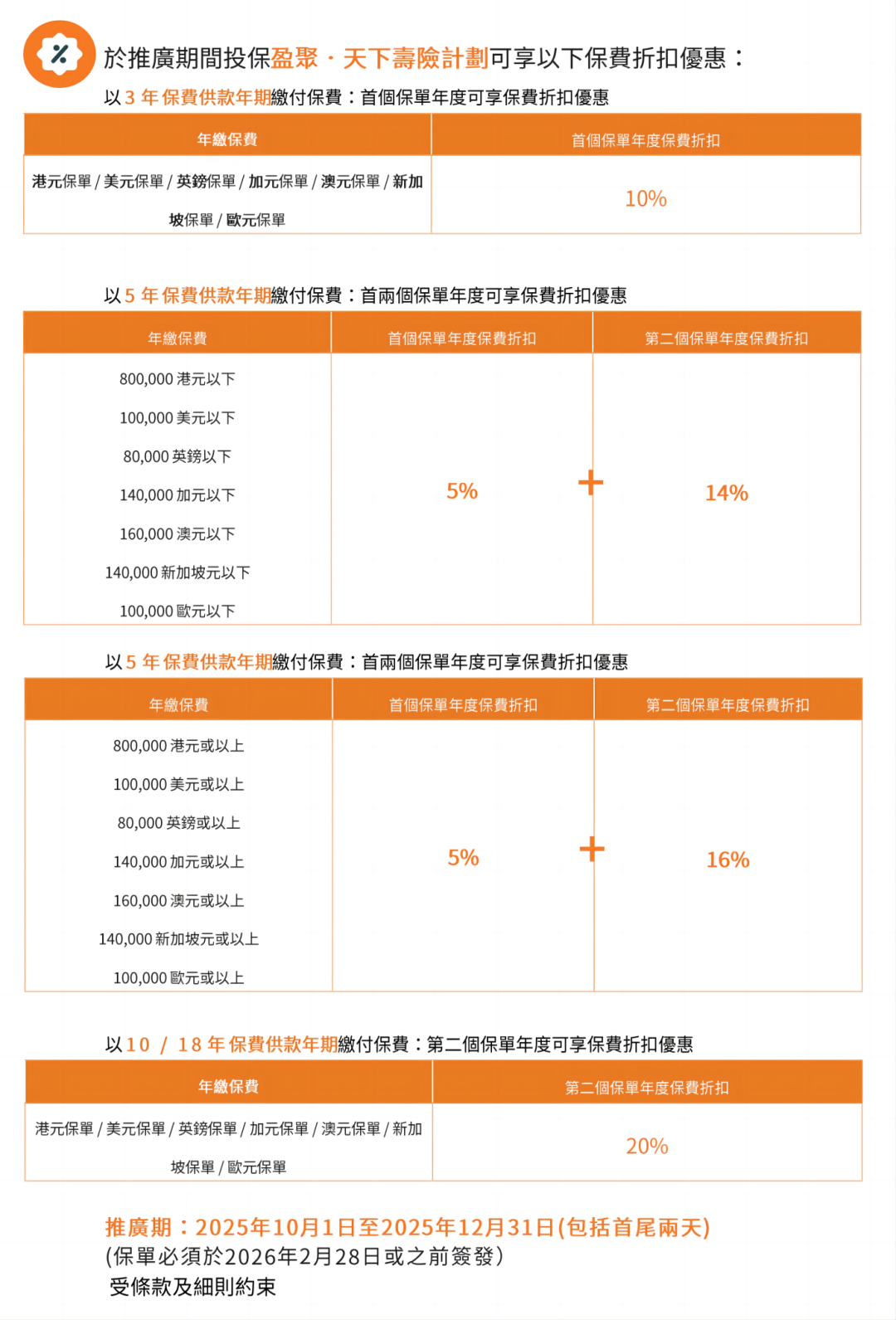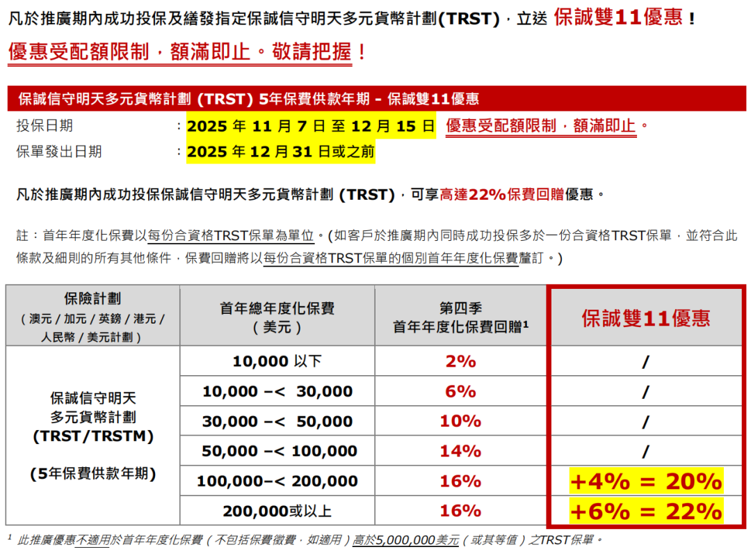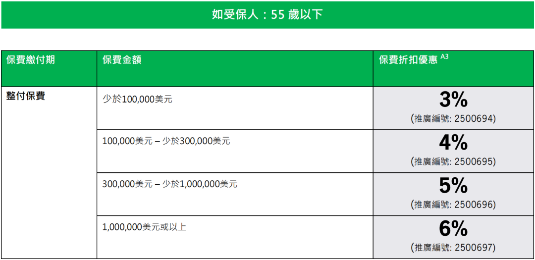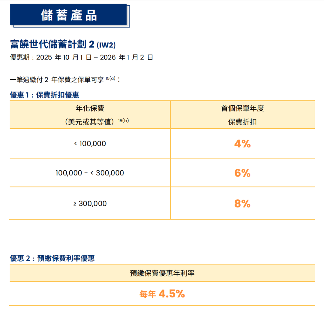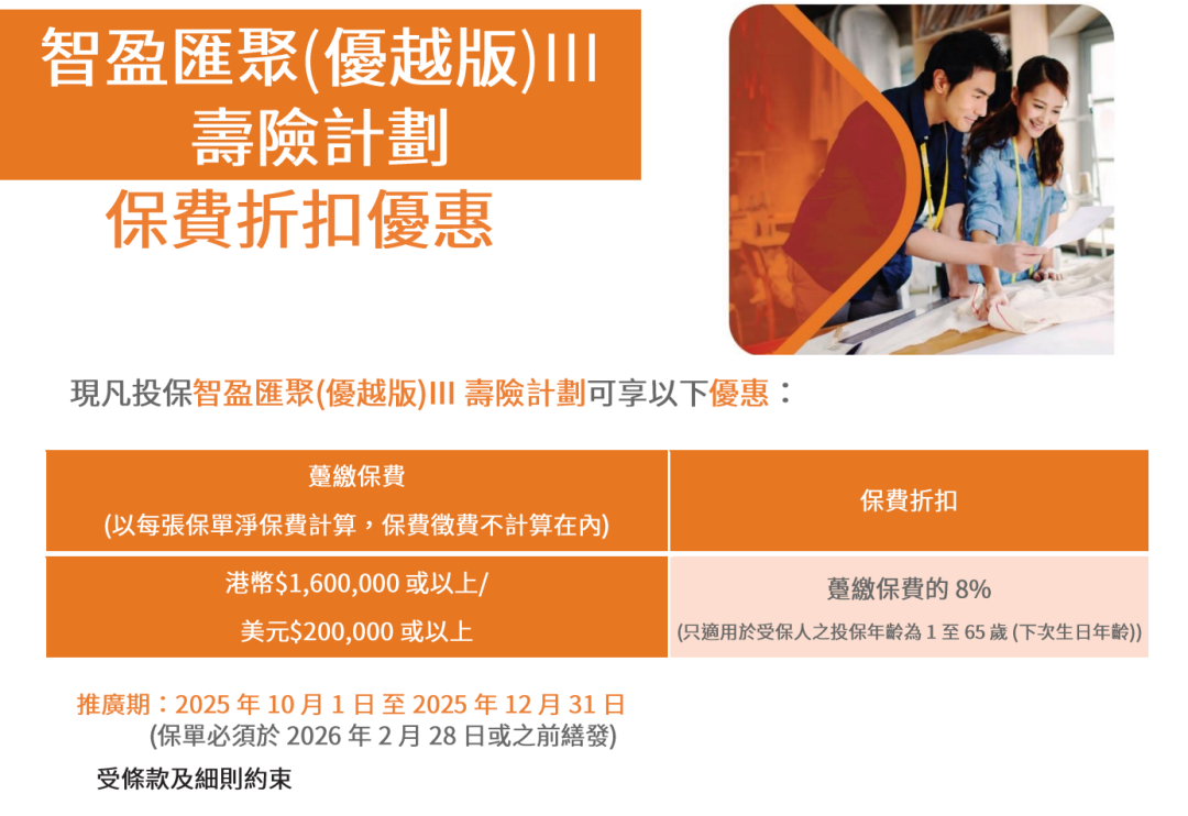 趸交:港币160万或以上/美金20万或以上享保费折扣8%