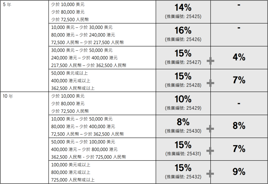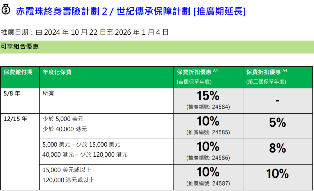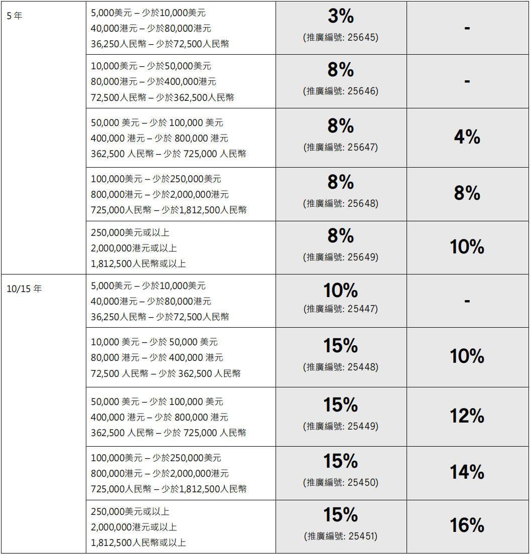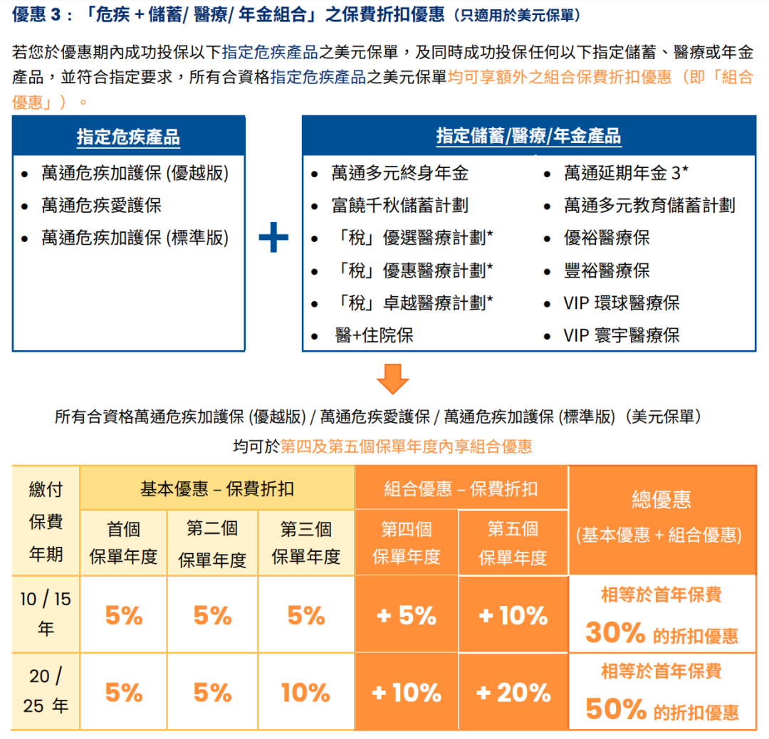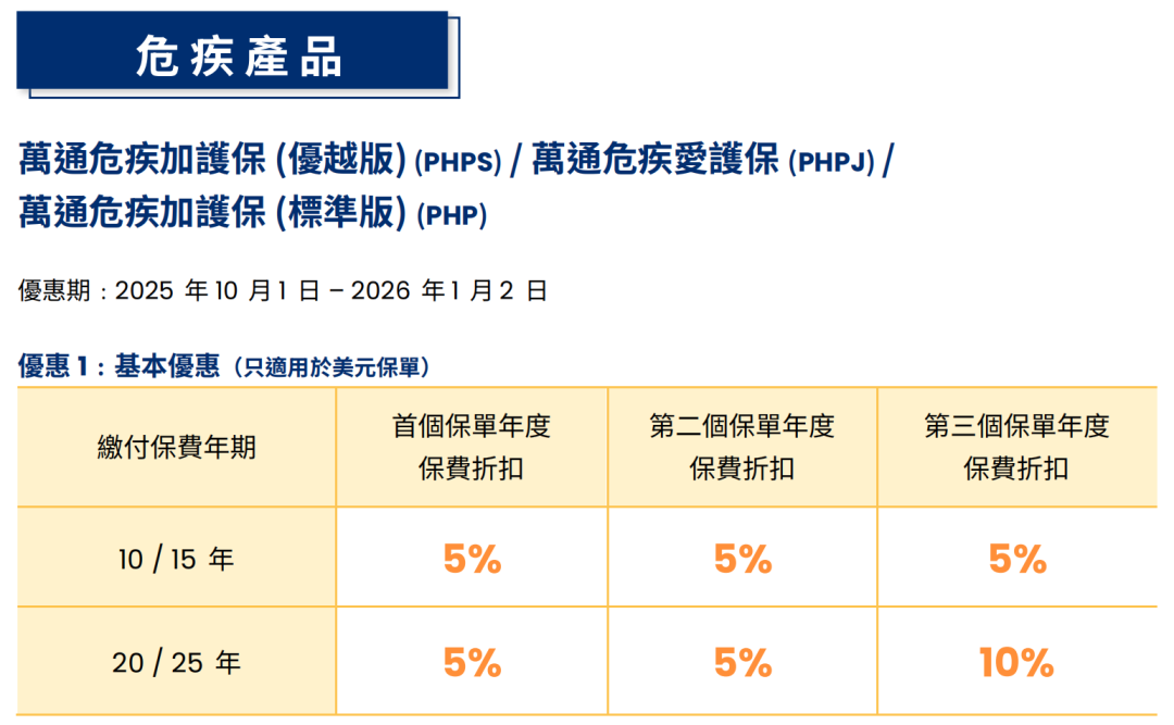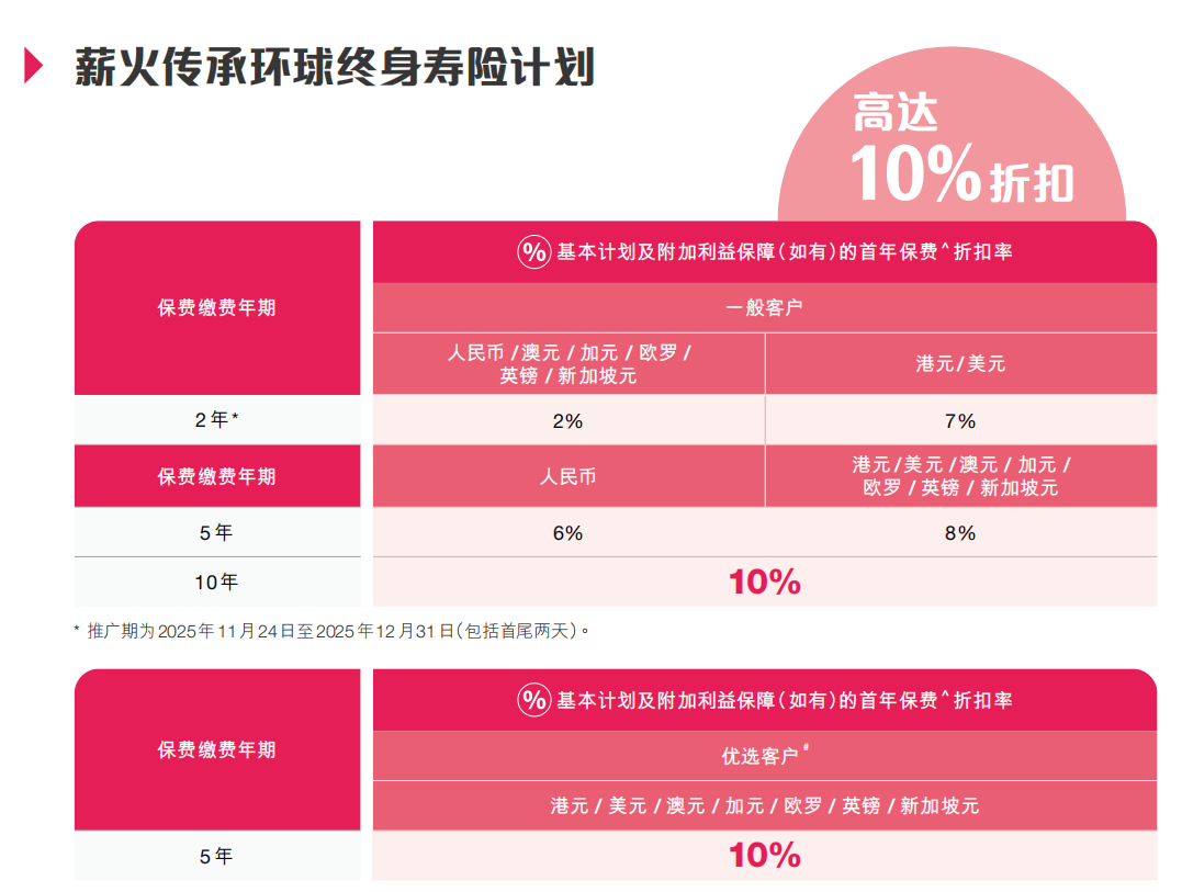 ▲10年期年缴金额达25,500港元或以上 /3,400美元或以上首10个保单年度合共享折扣优惠25%