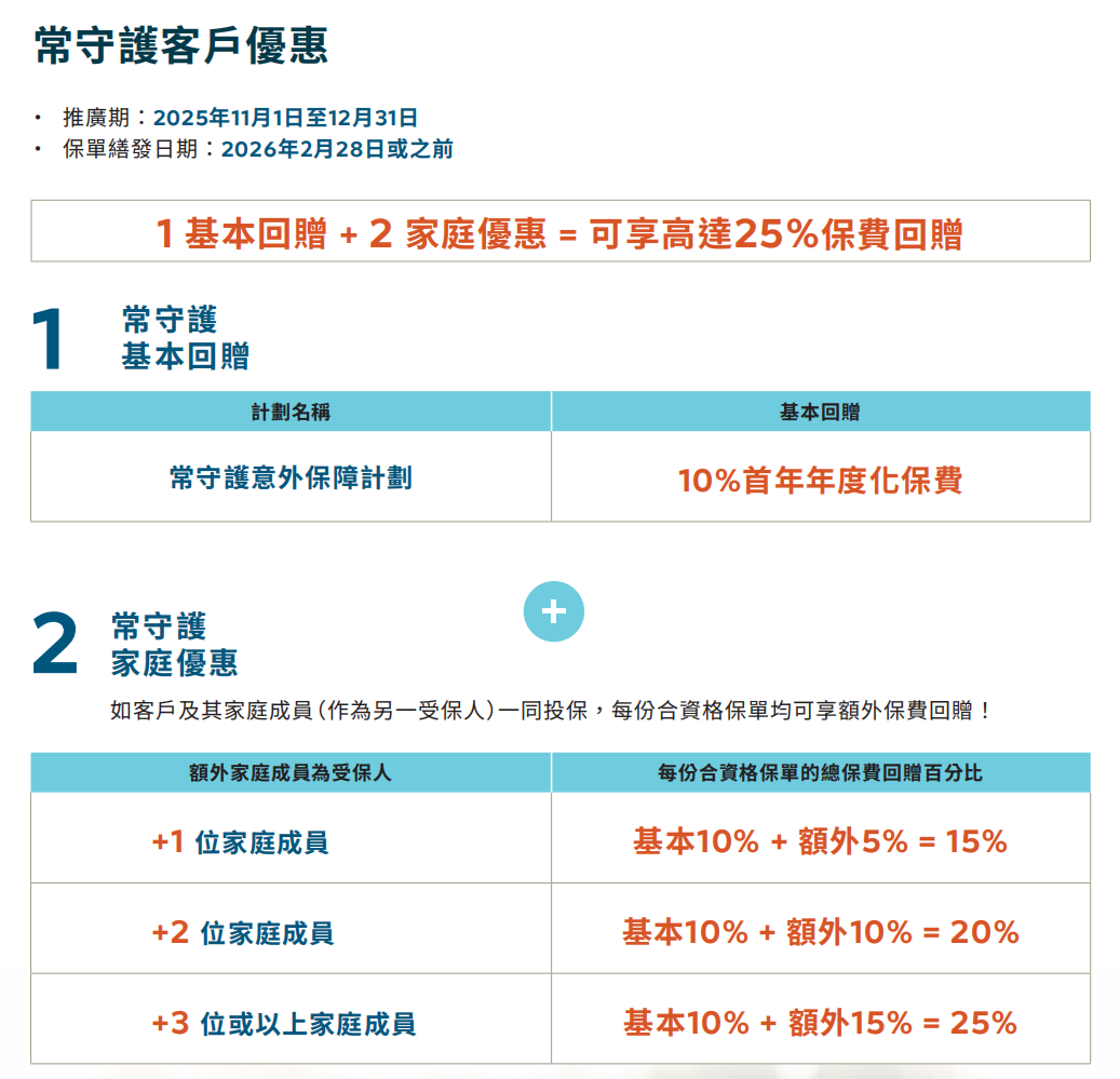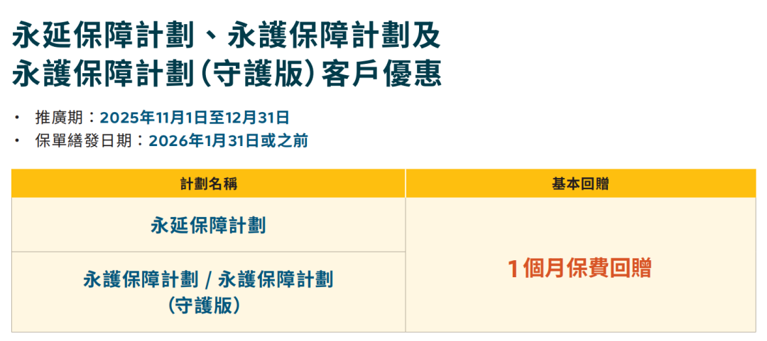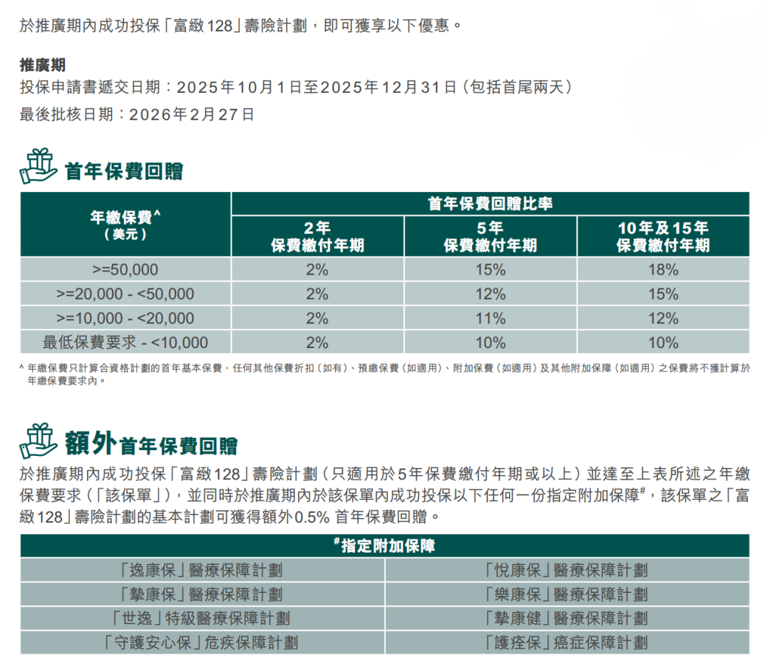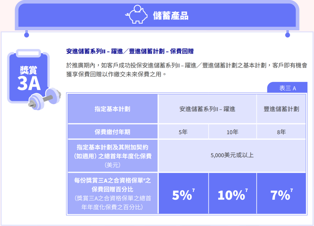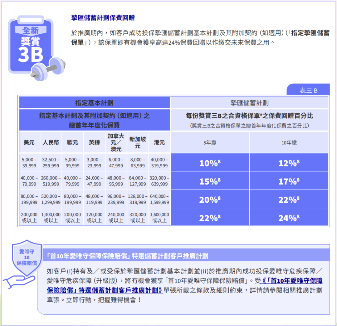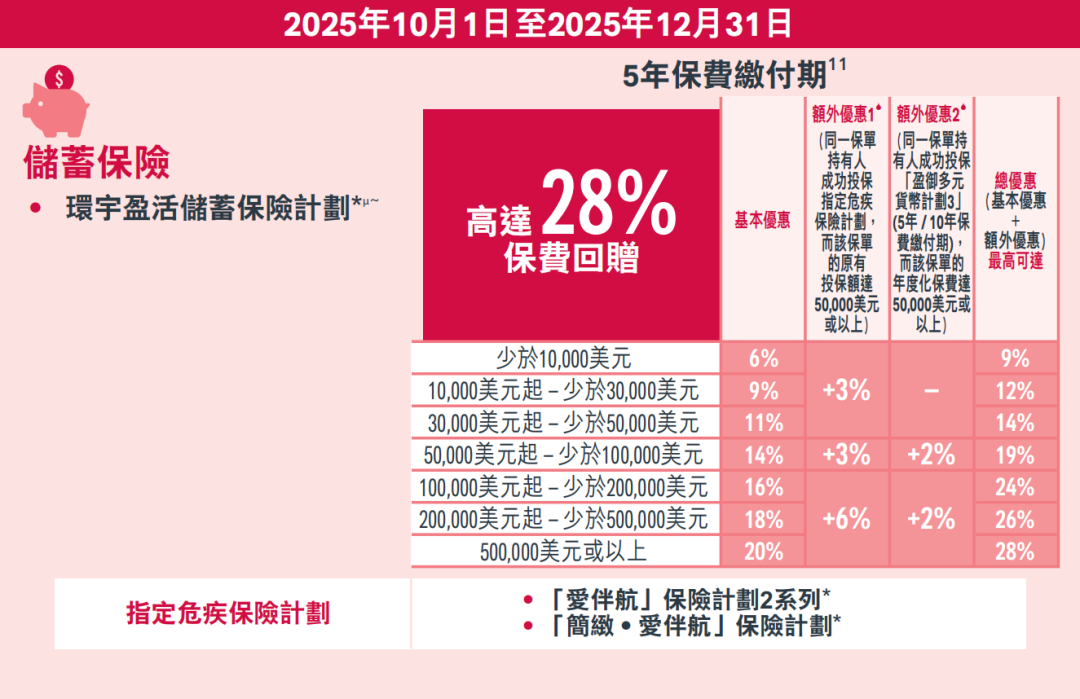 额外优惠一:同时投保指定储蓄险「环宇盈活(5年期)/盈御3(5年/10年期)」,额外增加3个月保费回赠,优惠高达6个月保费回赠