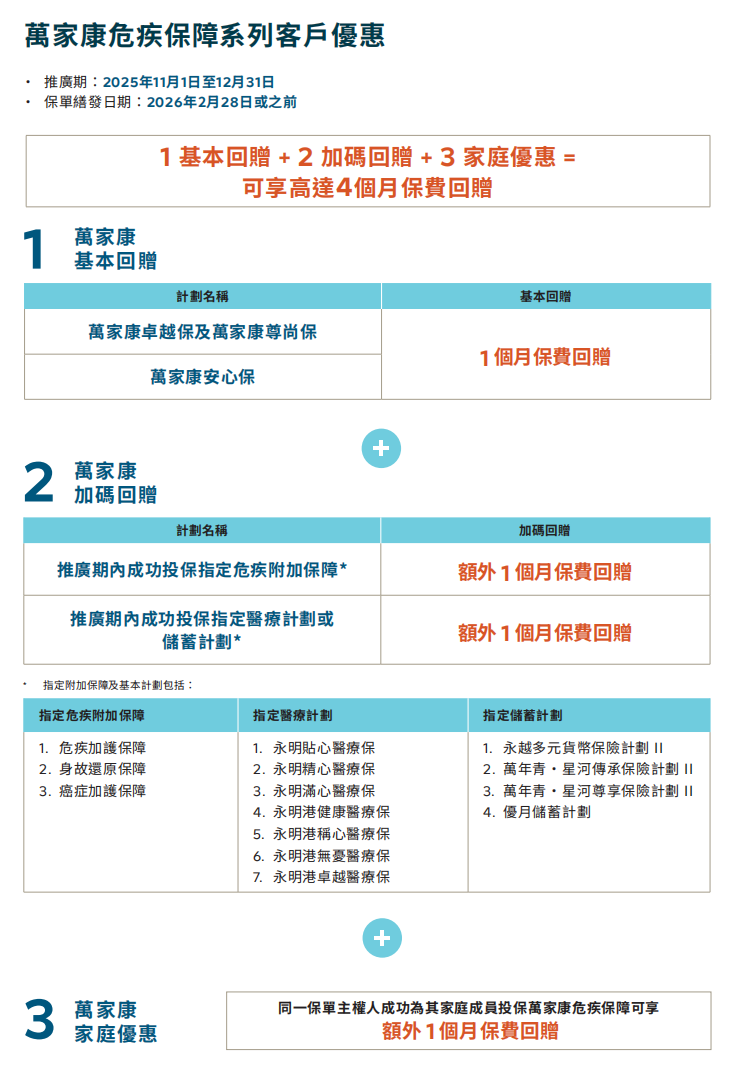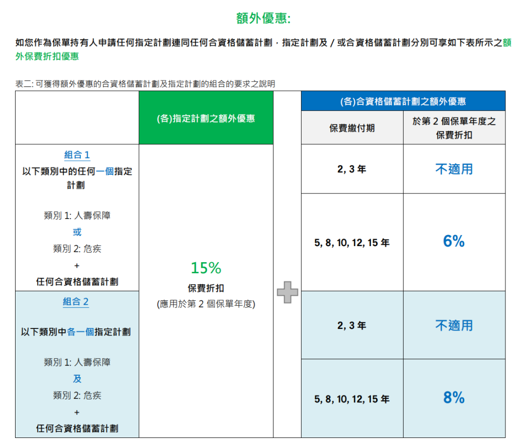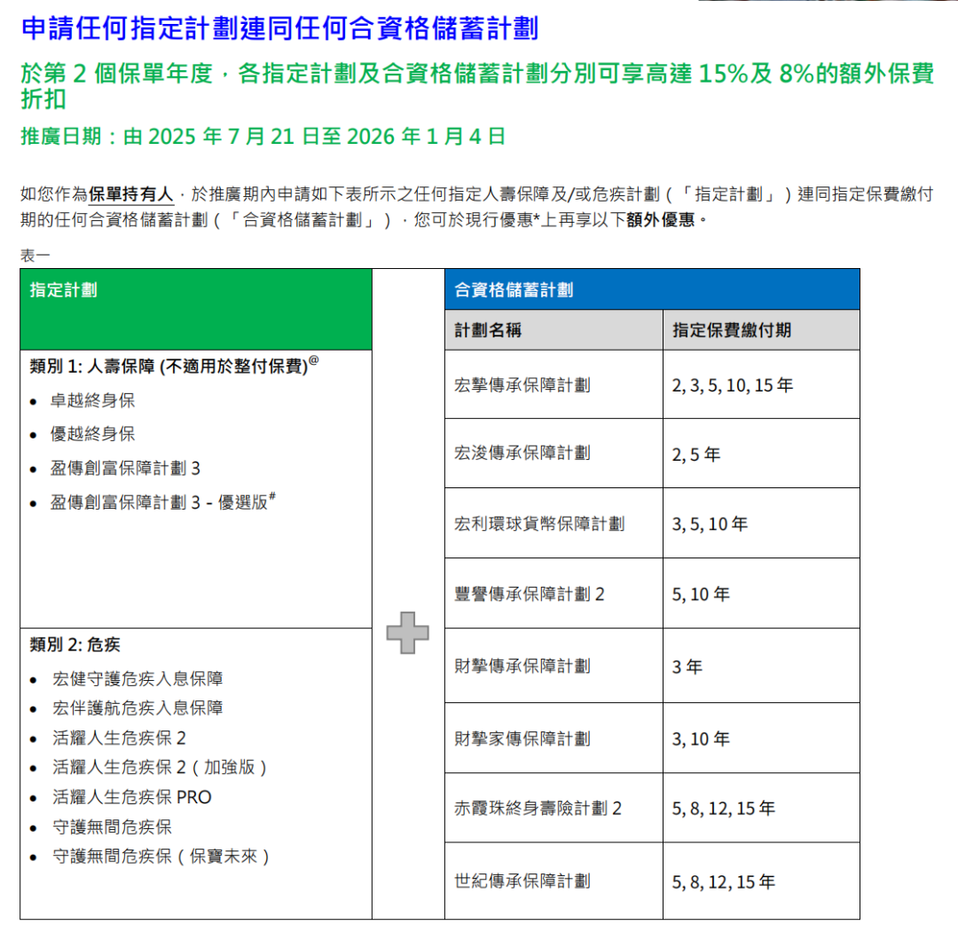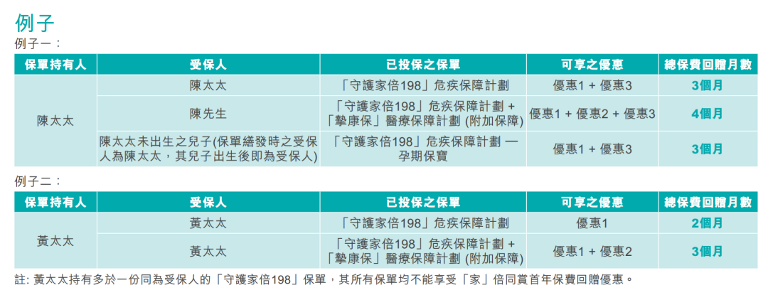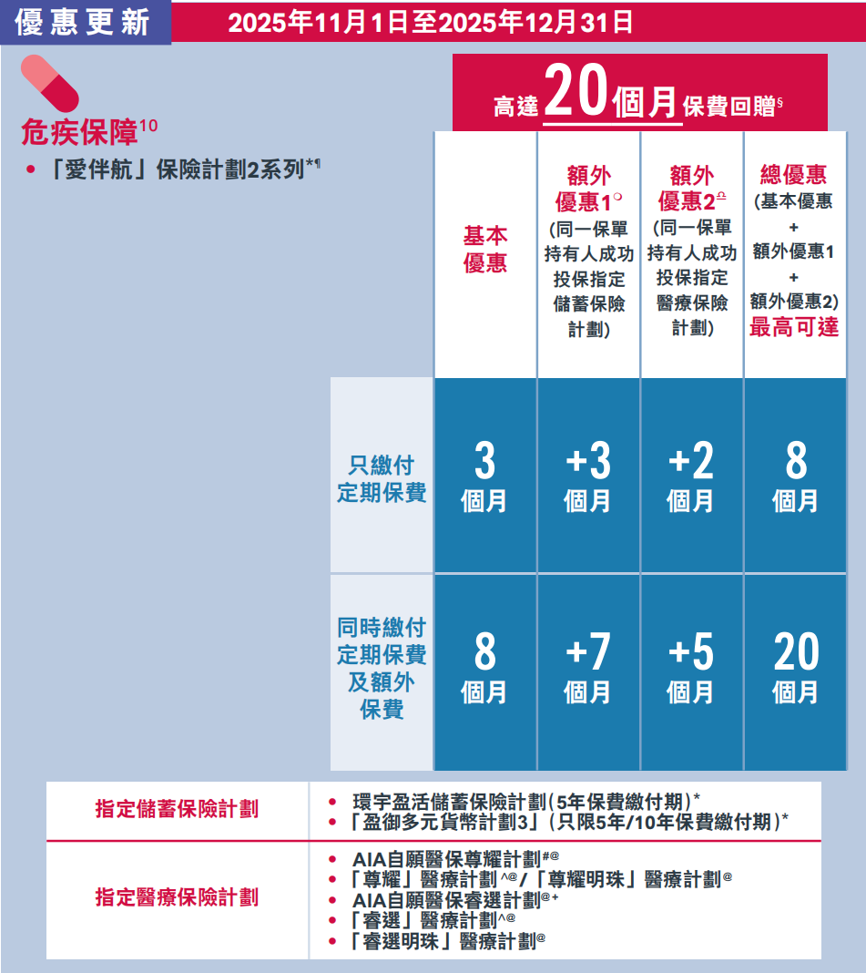 额外优惠二:同时投保指定医疗保险计划,额外再增加5个月保费回赠,总优惠高达20个月保费回赠