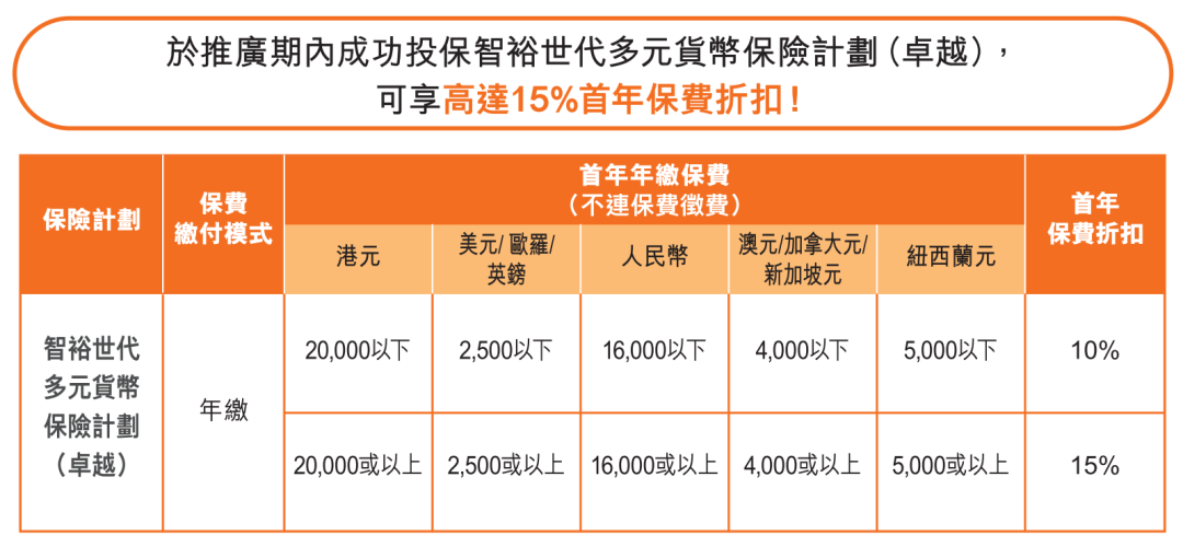 于推广期内成功投保智裕世代多元货币计划(卓越),可享首年保费折扣高达 15%!