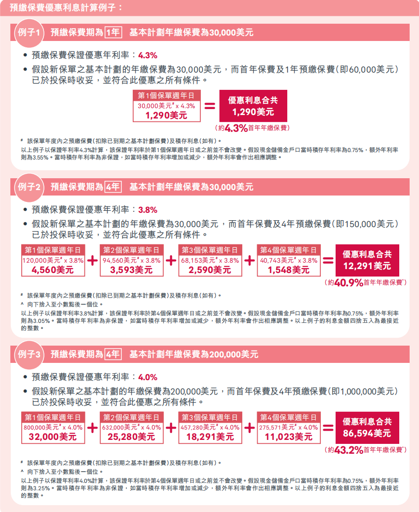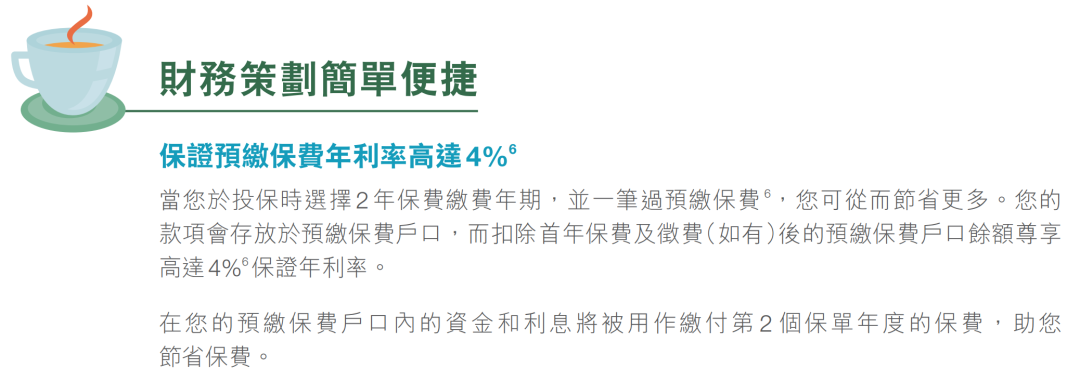 ▲ 投保时缴付2年保费可享预缴保费优惠年利率高达4.3%