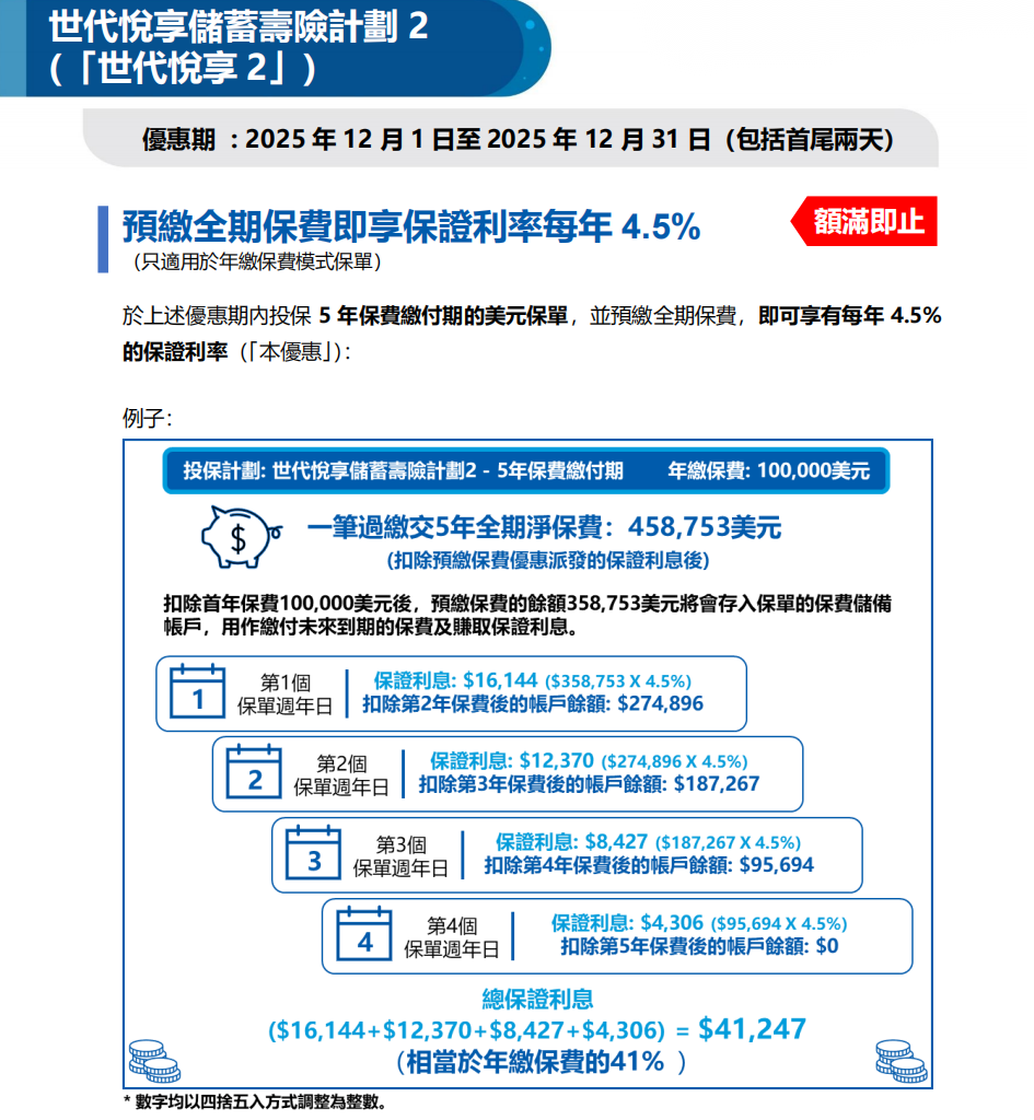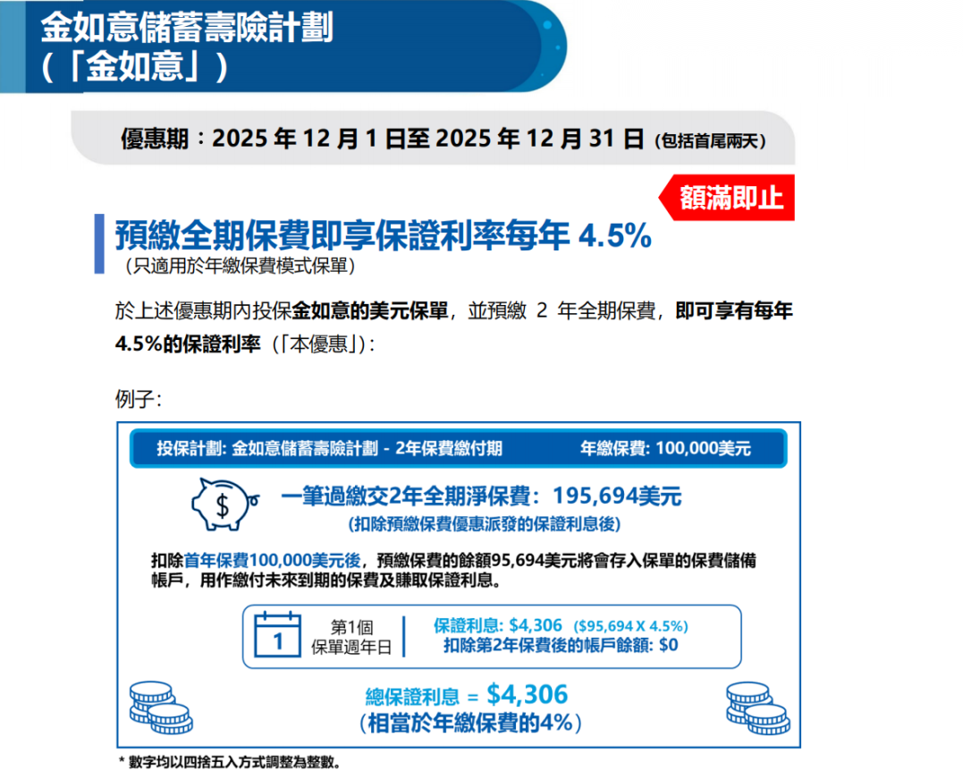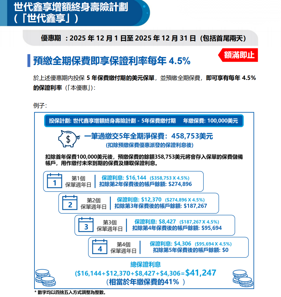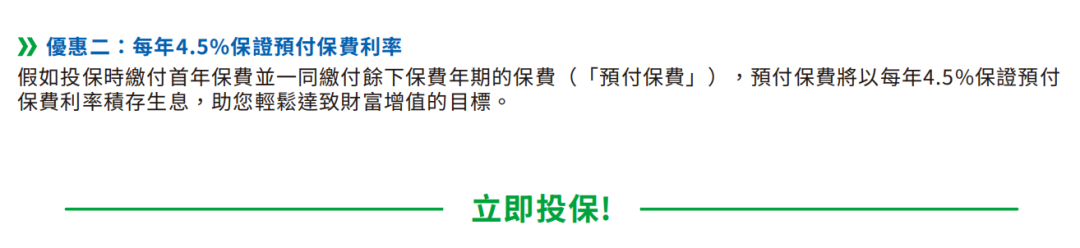 优惠:预缴全期保费即享保证利率每年4.5%(额满即止)