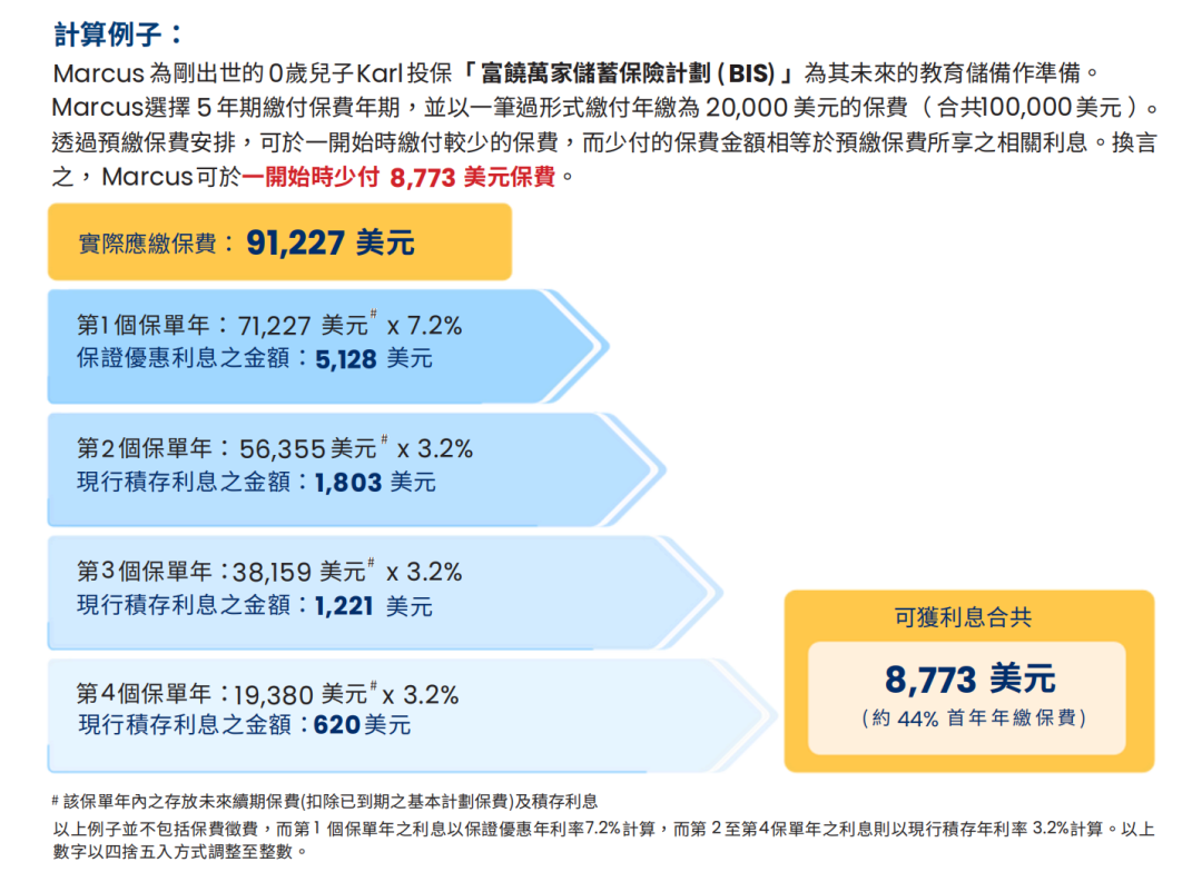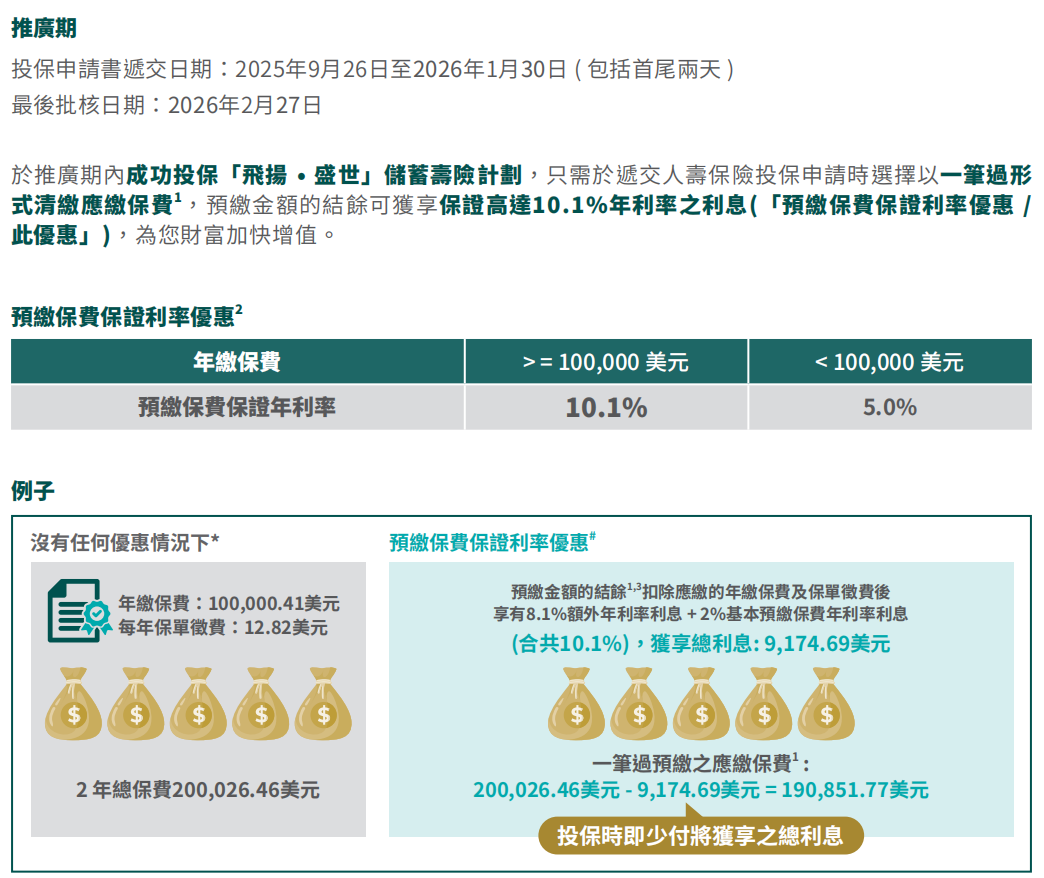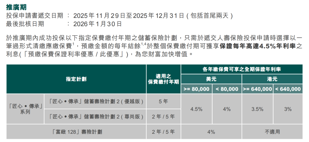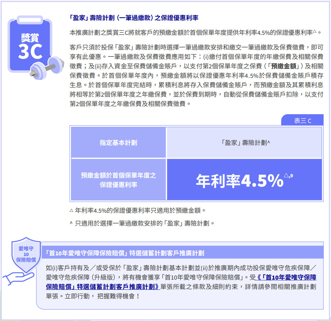 优惠:预缴全期保费即享保证利率每年4.5%(额满即止)