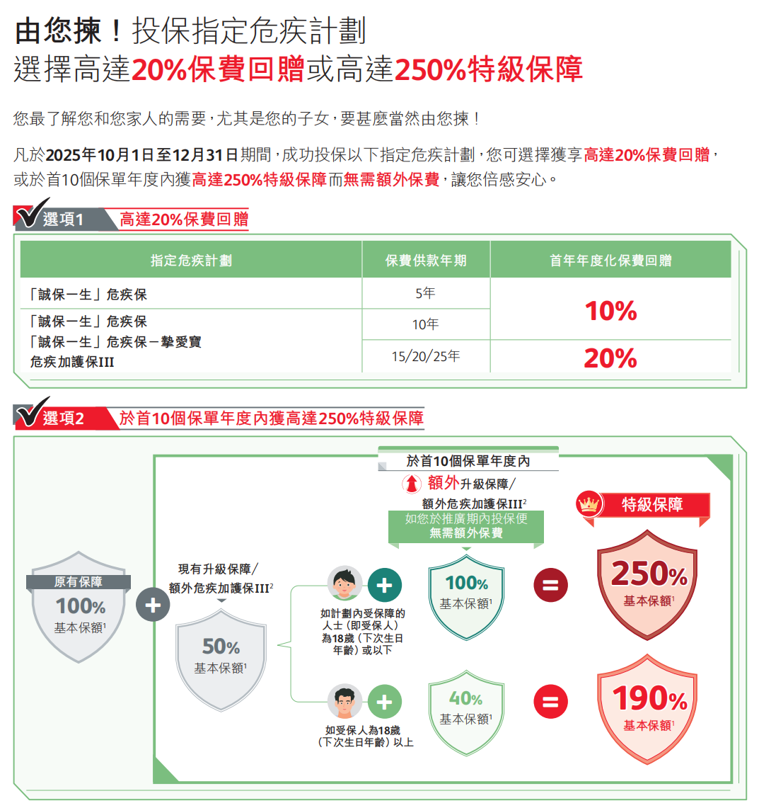 成功投保以下指定危疾计划,您可选择获享高达20%保费回赠,或于首10个保单年度内获高达250%特级保障而无需额外保费,让您倍感安心。