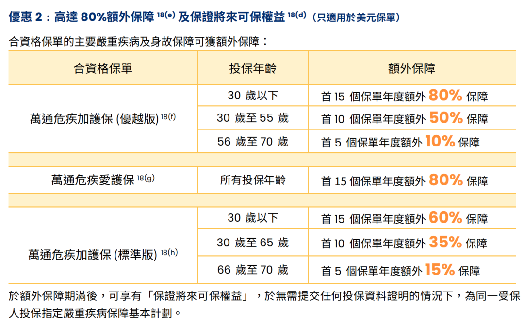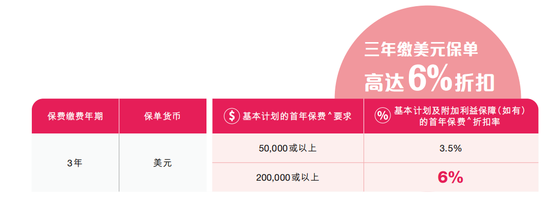 ▲ 额外优惠1:同一保单持有人成功投保「爱伴航2/简致•爱伴航」系列(而该保单的原有投保额度达5万美金或以上)增加3%-6%保费回赠