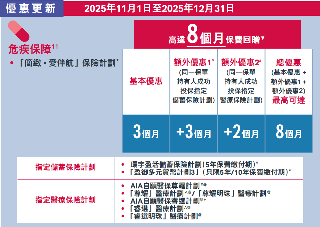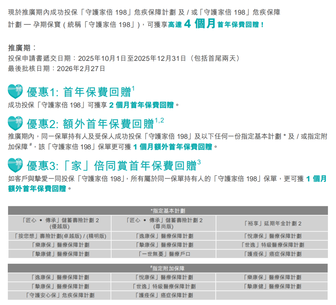额外优惠二:同时投保指定医疗保险计划,额外再增加2个月保费回赠,总优惠高达8个月保费回赠