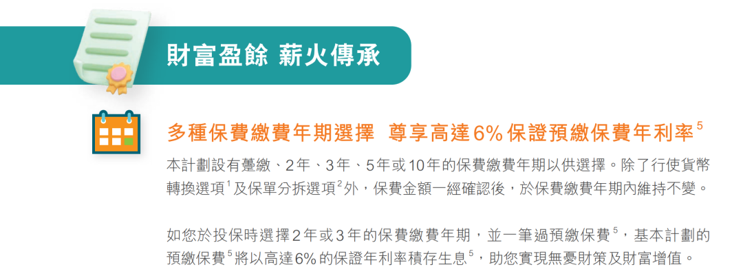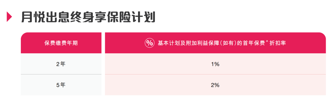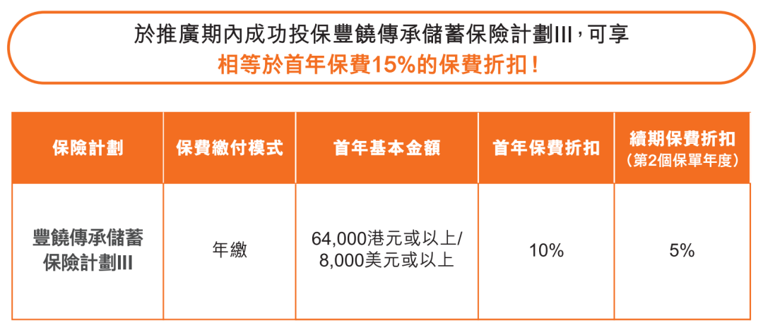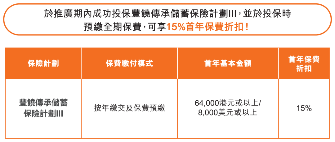 ▲ 于推广期内成功投保丰饶传承3,预缴保费模式可享首年保费折扣 15%