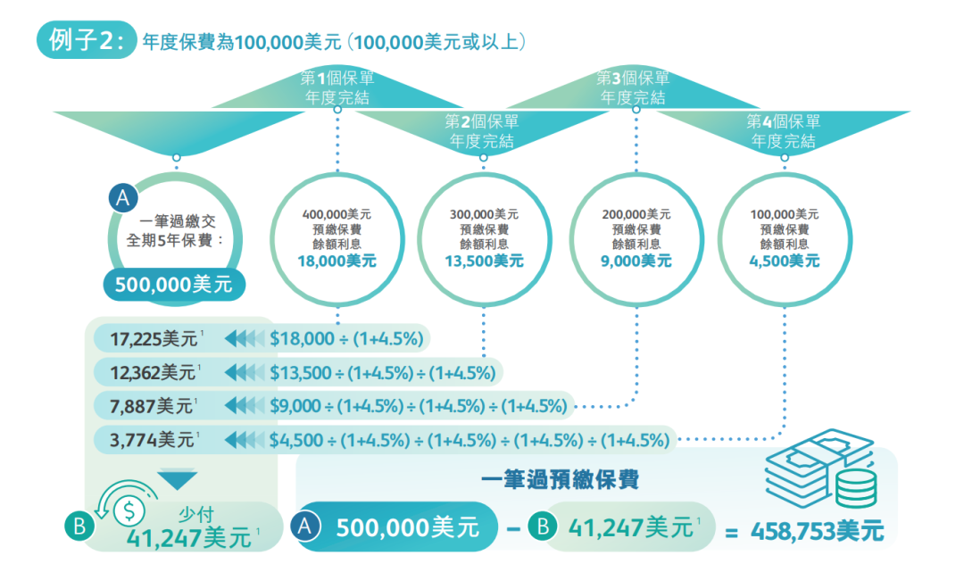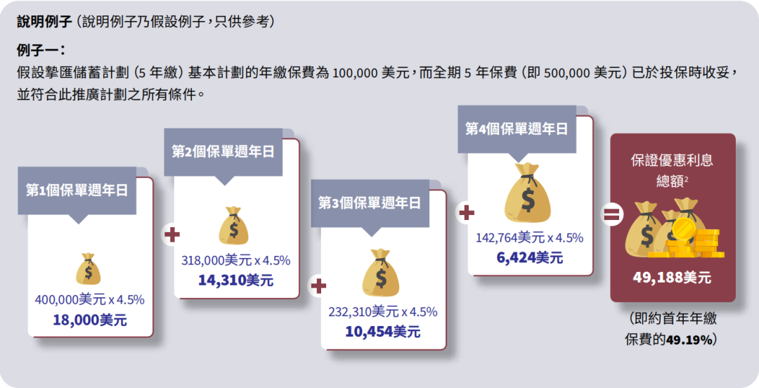 一次性缴纳5年保费(美元保单),即可享有每年4.5%的保证利率