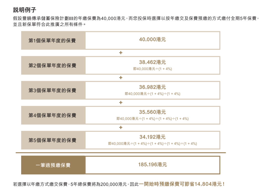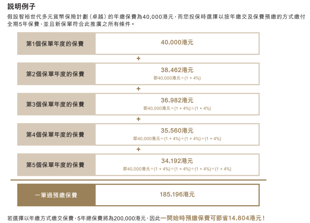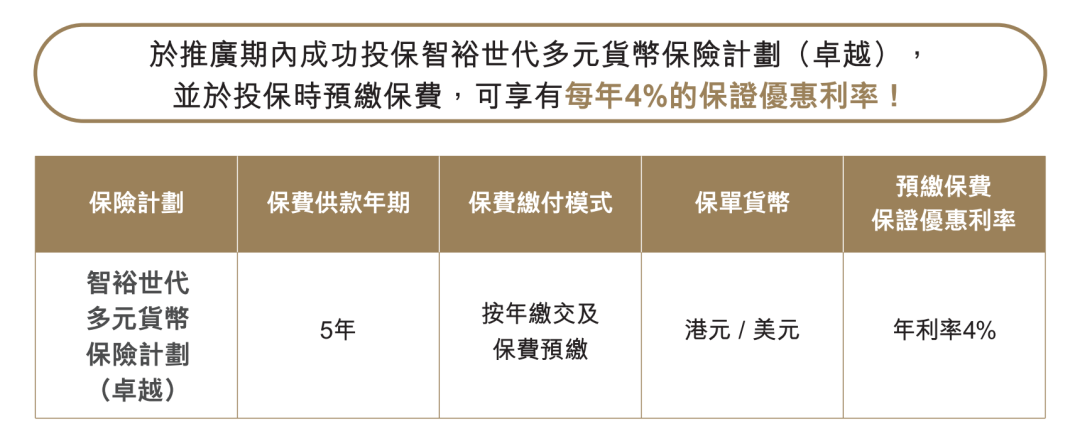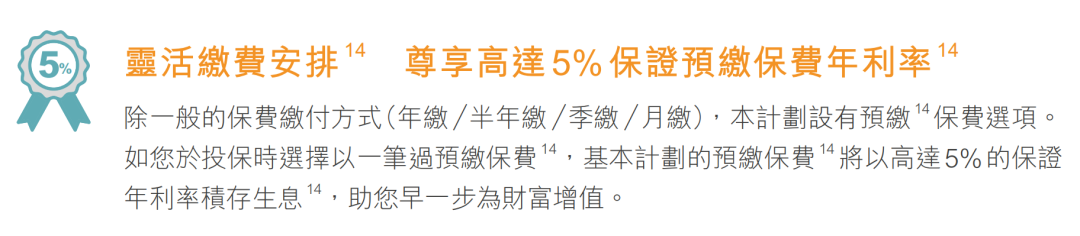 ▲ 投保时缴付5年保费可享预缴保费优惠年利率高达4.0%