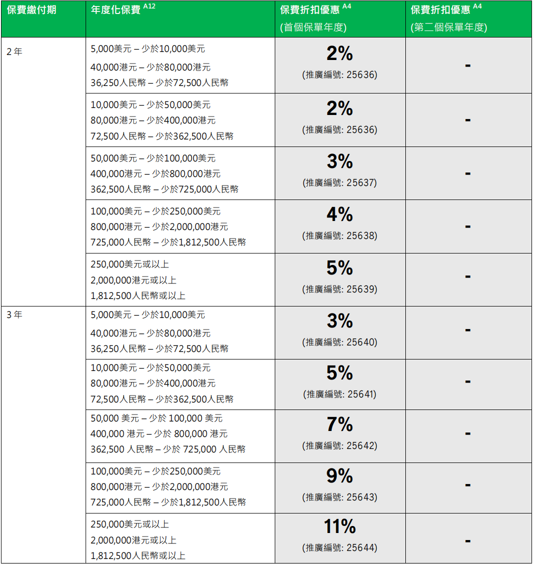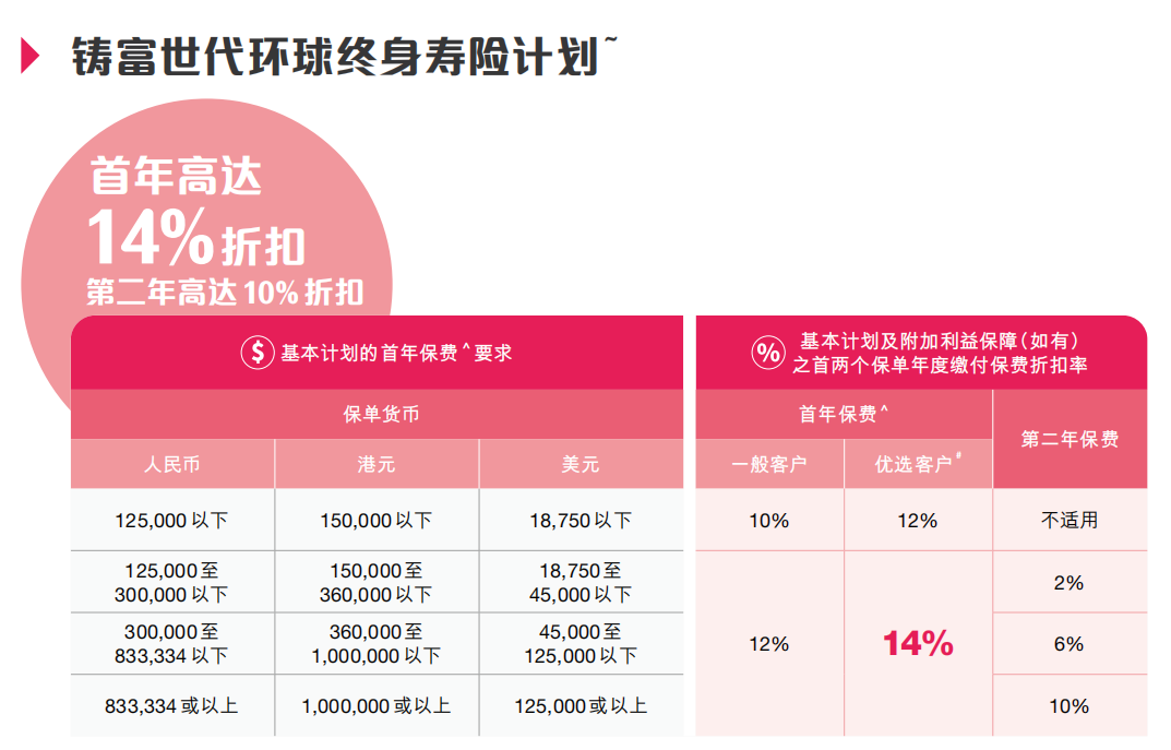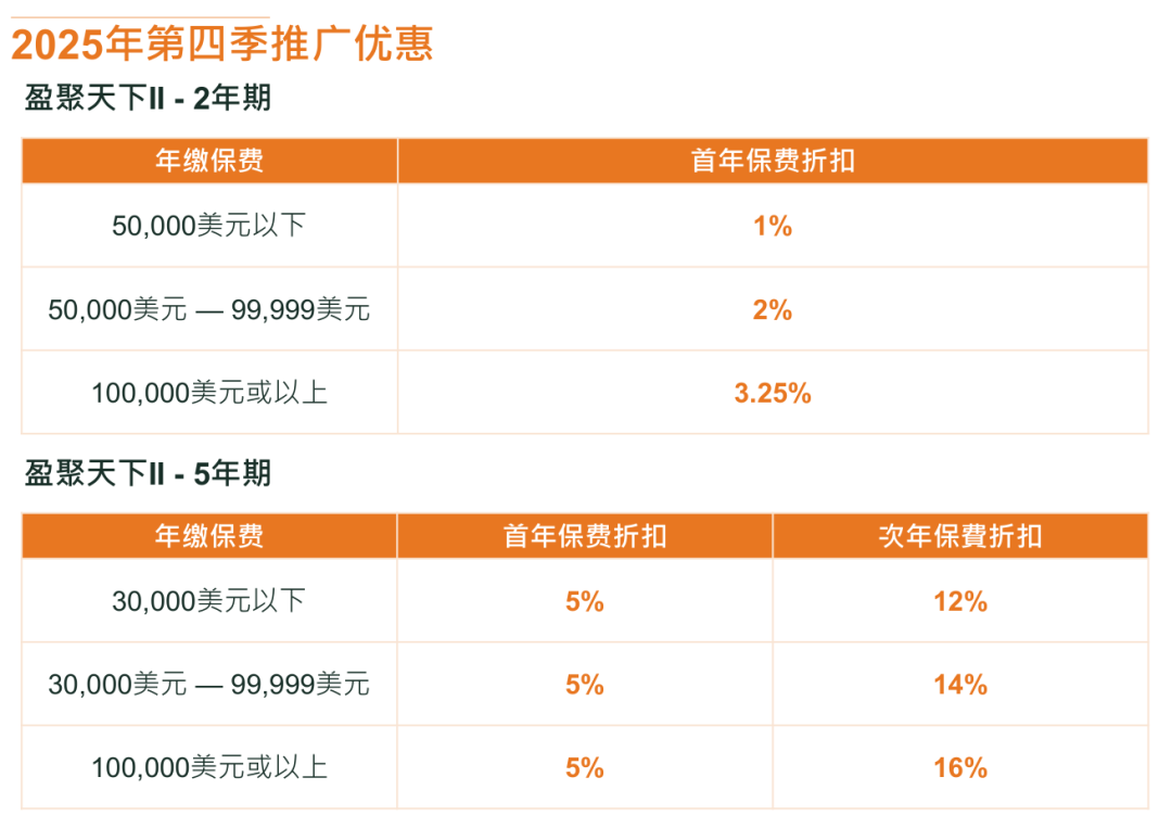 USD12.5万及以上:首年保费折扣高达14%、次年折扣10%