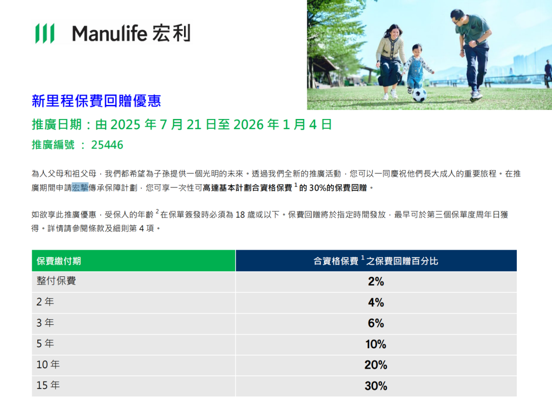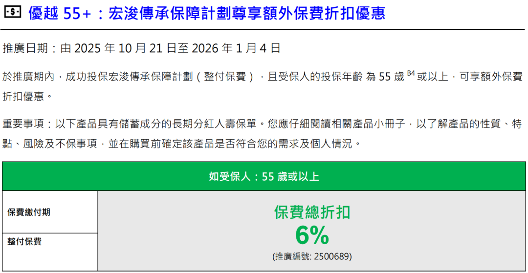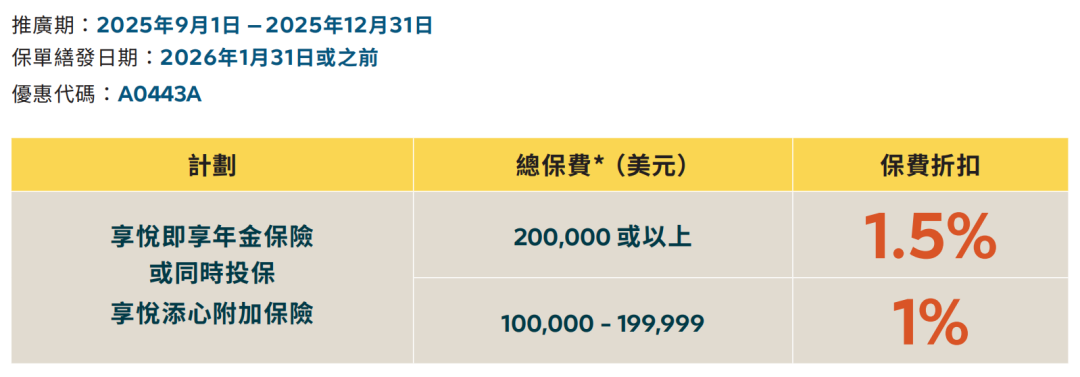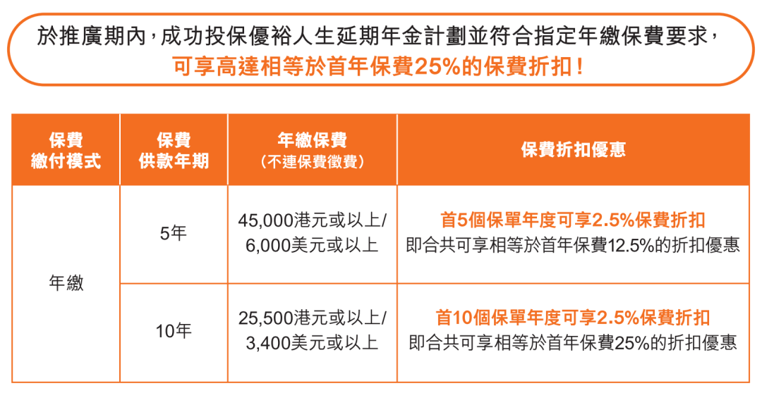 ▲ 于推广期内成功投保优裕人生延期年金並符合指定年缴保费要求,可享保费折扣合共高达 25%