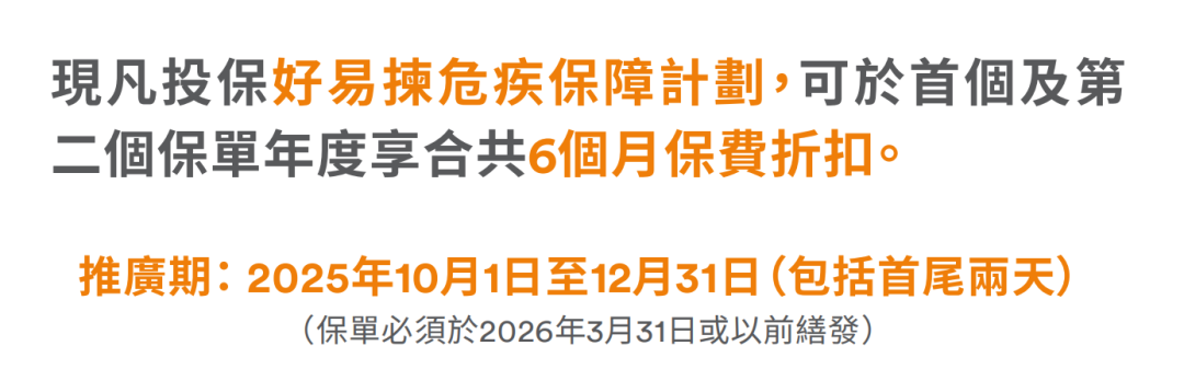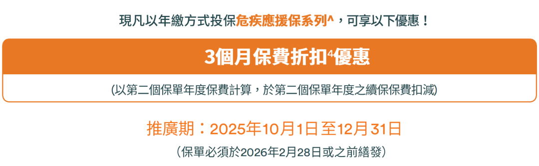 以年缴形式投保危疾应援保系列,可享高达 3个月 保费折扣优惠
