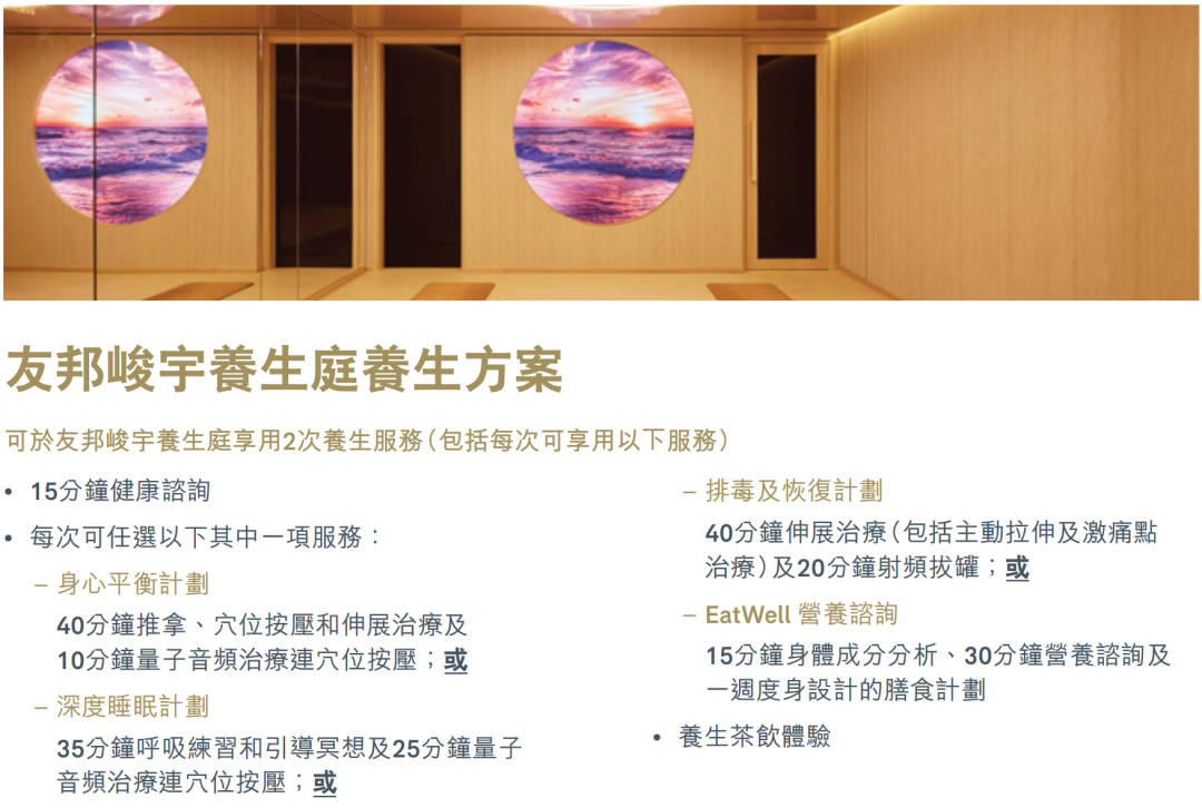 c. 养生方案预订视乎实际供应情况,并设有不适用日期。有关不适用日期请向友邦峻宇养生庭查询。