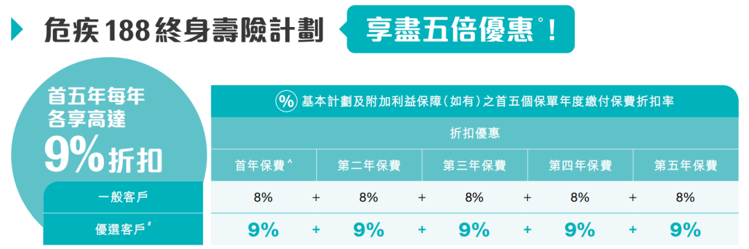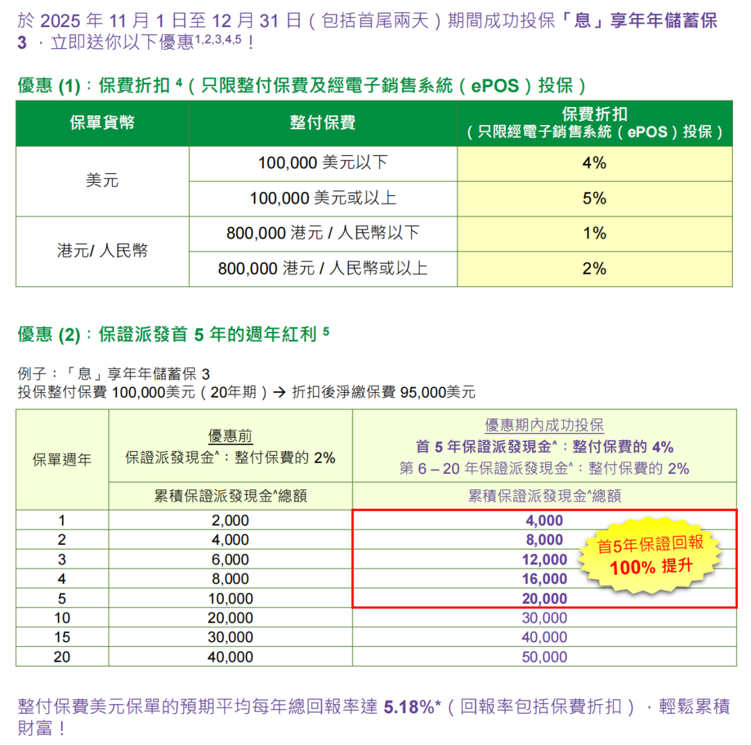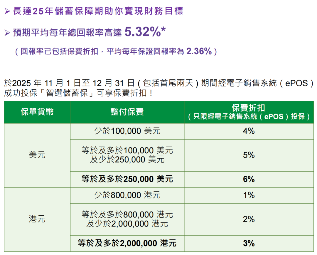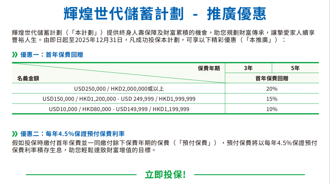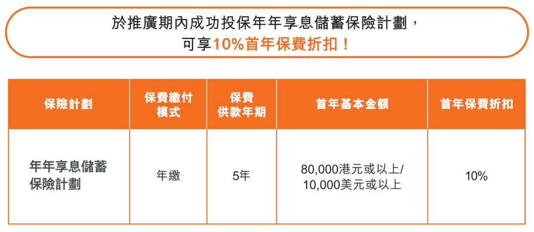 ▲ 于推广期内成功投保年年享息储蓄保险计划,可享首年保费折扣 10%