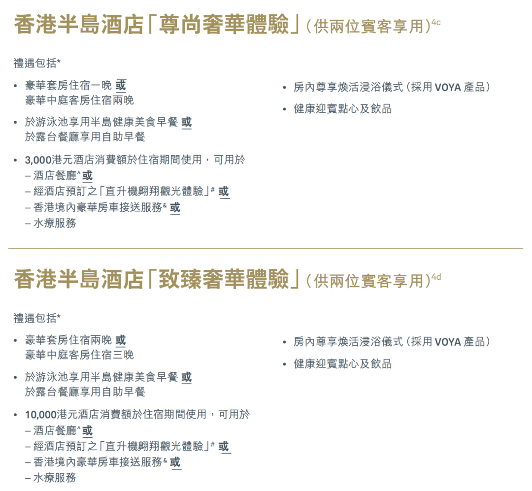 a. 香港半岛酒店之“尊尚奢华体验”及“致臻奢华体验”礼遇不可兑换成现金、转售或退款,亦不可与其他酒店优惠同时使用。