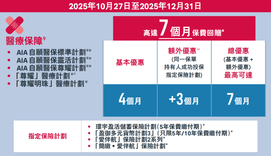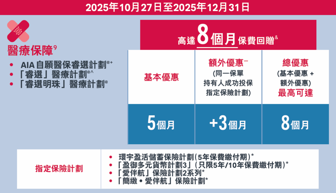 ▲ 投保「AIA自愿医保睿选/睿选医疗/睿选明珠医疗」计划,享5个月基本保费回赠