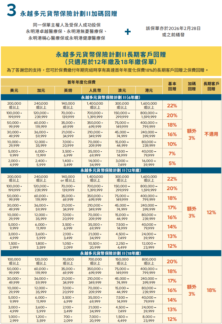 ▲ 额外优惠2:同一保单持有人成功投保「盈御多元货币3(5/10年期)」(而该保单的年度化保费达5万美金或以上)增加2%保费回赠