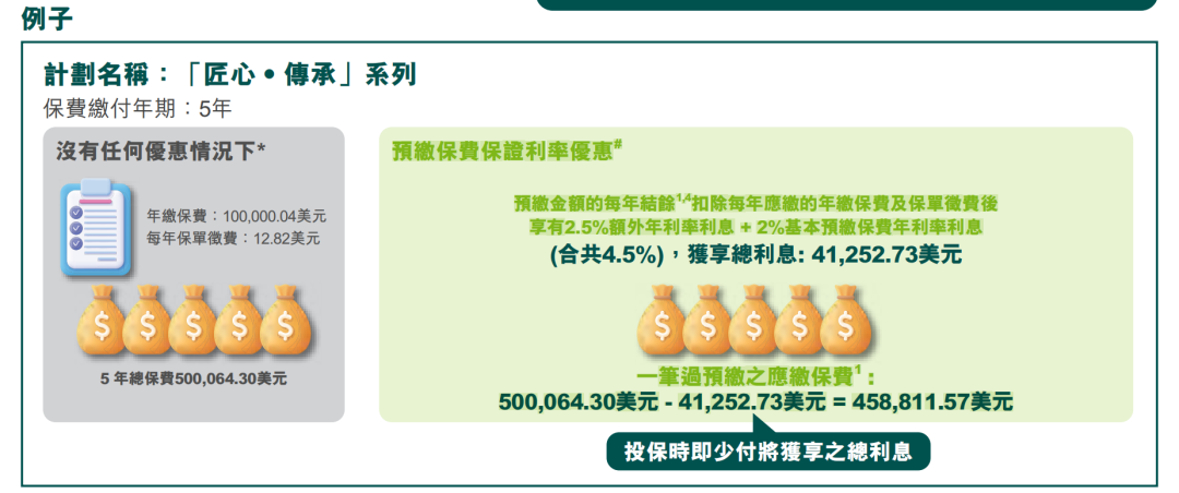 ▲ 一次性缴纳2/5年保费,可享保证优惠年利率4.75%