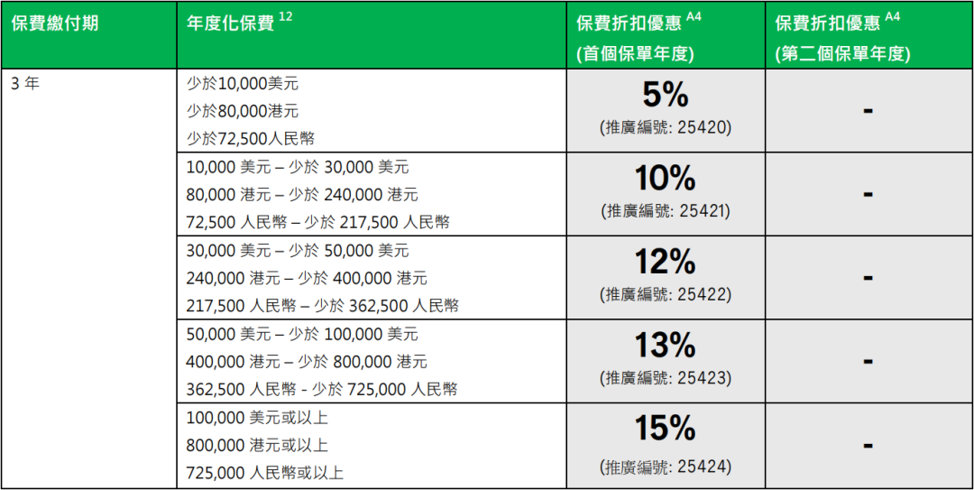 USD4.5万-12.5万以下:首年保费折扣高达14%、次年折扣6%