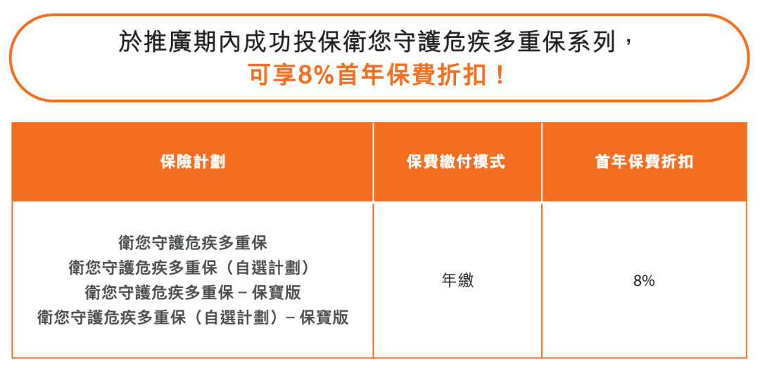 于推广期内成功投保卫您守护危疾多重保系列,可享首年保费折扣高达 8%!
