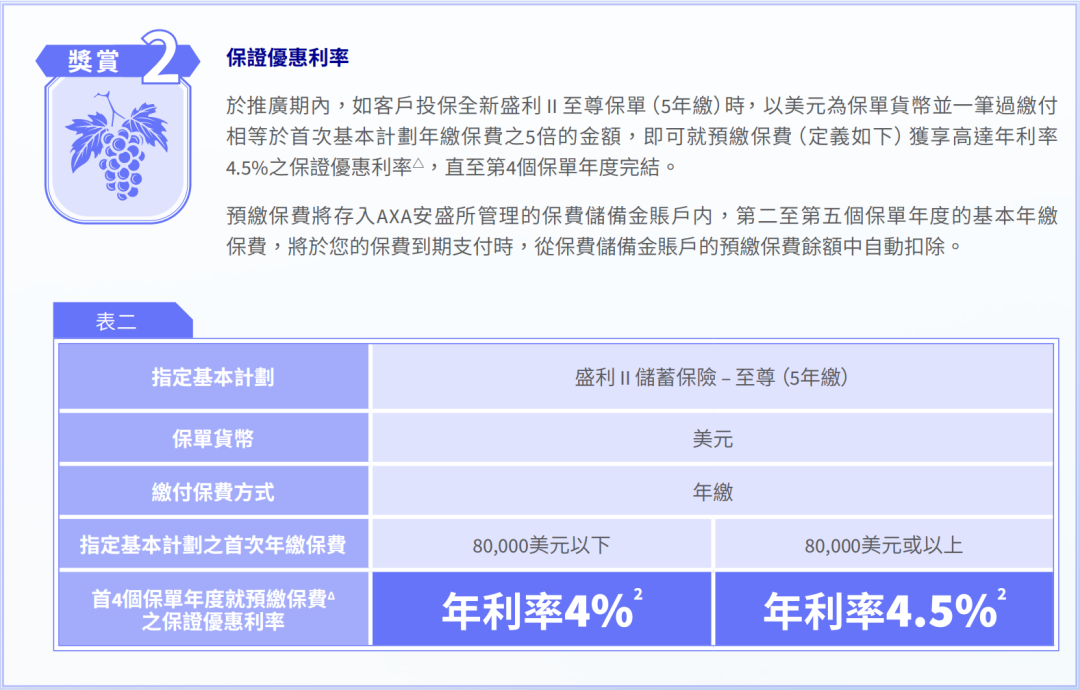 一次性缴纳2年保费(美元保单),即可享有每年4.5%的保证利率