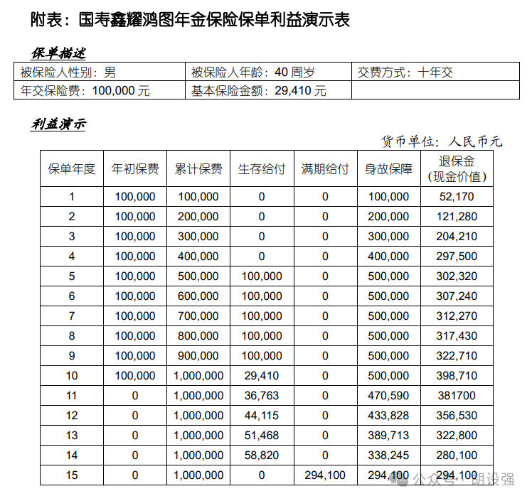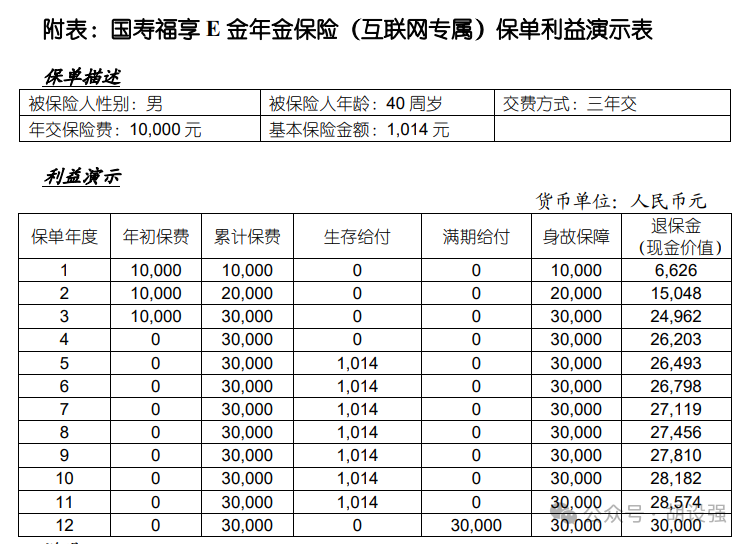 国寿福享E金年金保险(互联网专属),40岁男性,10万3年交,12年满期,现金流值如下:-100000-100000-100000001014101410141014101410141014300000