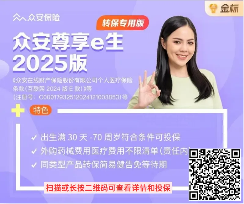 百万医疗险 ● ★★ 众安尊享e生2025版百万医疗险 1、出生满30天-70周岁符合条件可投保; 2、外购药械费用医疗费用不限清单(责任内); 3、原除外经核保复议可获更友好承保条件; 4、拓展102家民营机构,特药清单扩展至312种★ 众安尊享e生2025版百万医疗(转保专用版),外购药械费用医疗费用不限清单(责任内);同类型产品转保简易健告免等待期★ 人保优享宝贝少儿中高端医疗险,可附加门急诊责任;0免赔,100%赔付;住院保障全面,保院外特药,含重疾确诊和住院津贴★ 众安•成长乐•少儿百万医疗保险(0免赔),责任内住院和部分门诊0免赔,不限社保;50 种特定疾病特需MIP/国际部也能赔付★ 星医保少儿长期医疗产品组合计划;,特定疾病门诊也能保,成长无忧;主险可保证续保至18周岁;不限医保,保障范围广,放心赔★ 太平洋蓝医保百万医疗险(20年保证续保),附加住院津贴医疗保险金,保证续保期间内赔付总限额800万★ 蓝医保·长期医疗险(好医好药版),升级门急诊和特需医疗保障;外购药械100%赔付,进口原研,用药无忧;多家顶尖医院出院直赔★ 平安安欣保2.0(又名“长相安2号”)长期医疗保险(20年保证续保),加量不加价;新增指定疾病康复责任★ 太平洋蓝海一生百万医疗险,0-70周岁可保; 畅享500万海外先进医疗保障; 全家共享免赔额,全家投保最高8折★ 中银医无忧百万医疗险1、社保内外都能报2、30天-60周岁均可保,续保至100岁3、保障责任全,高额治疗费用均包含★ 蓝医保·住院医疗险,关爱版无健康告知,既往症也可赔付;可享受税收优惠;3年保证续保;家庭单优惠,至高优惠10%★ 平安e生保·长期医疗互联网专属保险产品组合,保证续保20年:无惧产品停售,额度超高:800万总额度,不惧医疗费用年年涨★ 平安E享平安百万医疗保险2023版,医疗保障最高600万(含质子重离子、特药含CAR-T);30天-70周岁均可投保,家庭单可享折扣优惠;可选重疾保障金、重疾住院津贴★ 泰康全人群百万医疗保险,保障总额600万 ;慢病人群、患者人群均可投保,符合条件有机会标体承保 ;含专属体检等特色增值服务★ 平安优享百万医疗保险,保额最高600万,30天-70周岁可投保,包含异地转诊 ★ 乐享e生无免赔额医疗险,国民医保无免赔版震撼上线,责任内1元钱也可赔!最高100万一般医疗保障!责任内不限医保目录范围,0免赔,续保年龄最高可至105周岁,另可选质子重离子医疗保障!★ 惠享e生重疾百万医疗(爸妈版),爸妈的大病医疗,50周岁-100周岁可投保最高200万保额,不限社保用药★ 惠享e生 众惠百万医疗,最高600万保障,最高可重新投保至100周岁,覆盖住院+特殊门诊+门诊手术+住院前后门急诊★ 京东安联臻爱无限医疗保险(互联网2023版),卓越计划,覆盖住院及癌症特药,可扩展特需医疗。基本计划,扩展承保特定既往病症★ 京东安联臻爱无限医疗保险家庭计划(互联网2023版),卓越计划最高1200万保额,覆盖住院及癌症特药,可扩展特需医疗;基本计划低至0.7元/天起,扩展承保特定既往病症★ 中华联合福享e生中老年医疗险,首款老年百万医疗,51-80岁可投保,200万基础保障,涵盖28种重大疾病,不限社保用药,年年送体检,体检结果良好保障还可额外再升级,可续保到100岁★ 众惠惠享e生百万医疗险2023升级款,符合条件的超优体免赔额最高可降至5000元;非特殊职业且符合其他投保条件的均可投保;扩展轻症可选责任,保障更全★ 太平洋乐城特医险1、投保门槛低,健告宽松; 2、保额高达600万,价格惠民; 3、乐城住院享津贴,进口药、进口械有保障★ 乐城全球特药险,600万特定药械保障;涵盖前沿进口药械责任;交通费用也可保★ 美亚“健力保”骨科特定疾病医疗保险,骨科类疾病全方位保障;骨科类疾病住院外购药械费用保障;骨科类疾病术后门诊康复费用保障