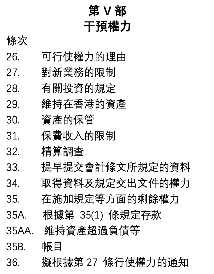 限制新业务 限制有关投资 规定由获得认可受托人保管资产 精算调查 行使对保险公司的控制权在施加规定等方面的剩余权利