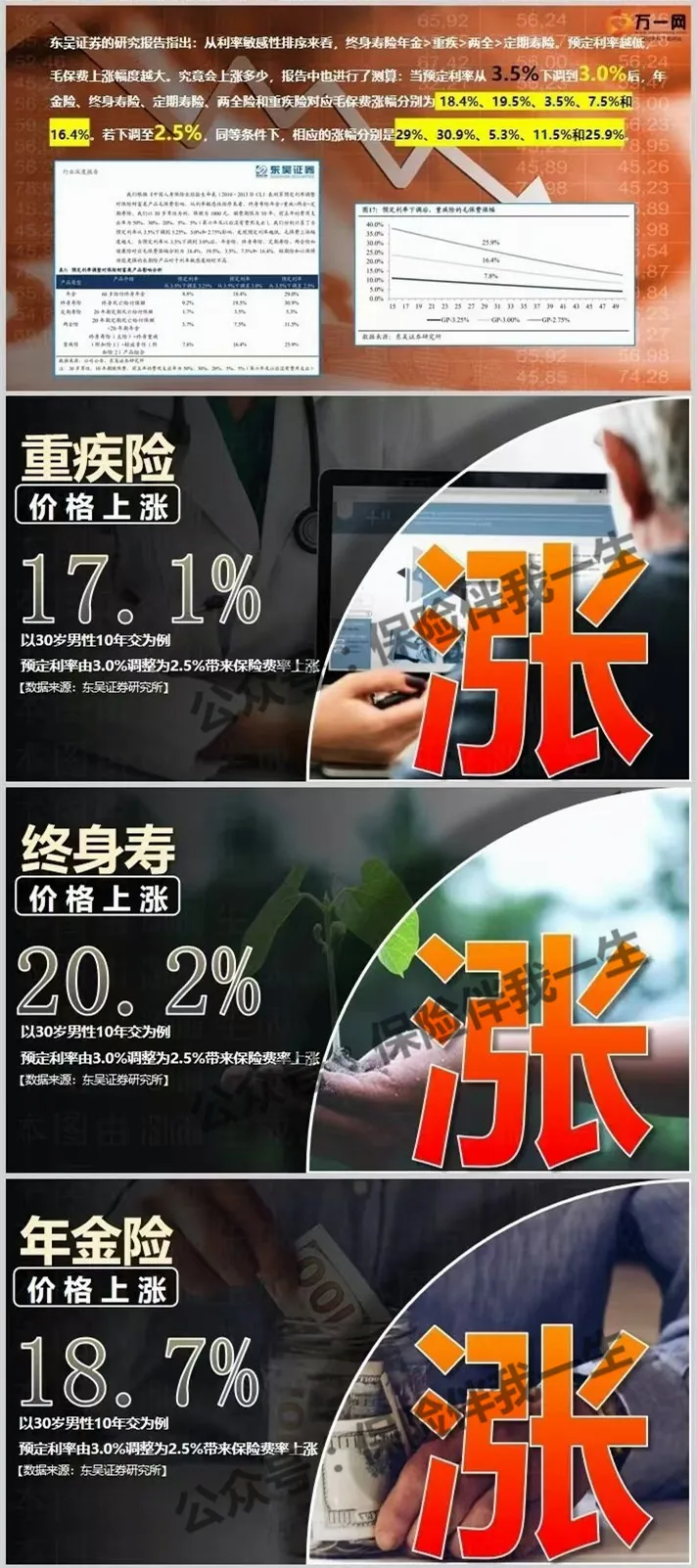 东吴证券的研究报告指出: 从利率敏感性排序来看,终身寿险年金>重疾>两全>定期寿险。预定利率越低毛保费上涨幅度越大。