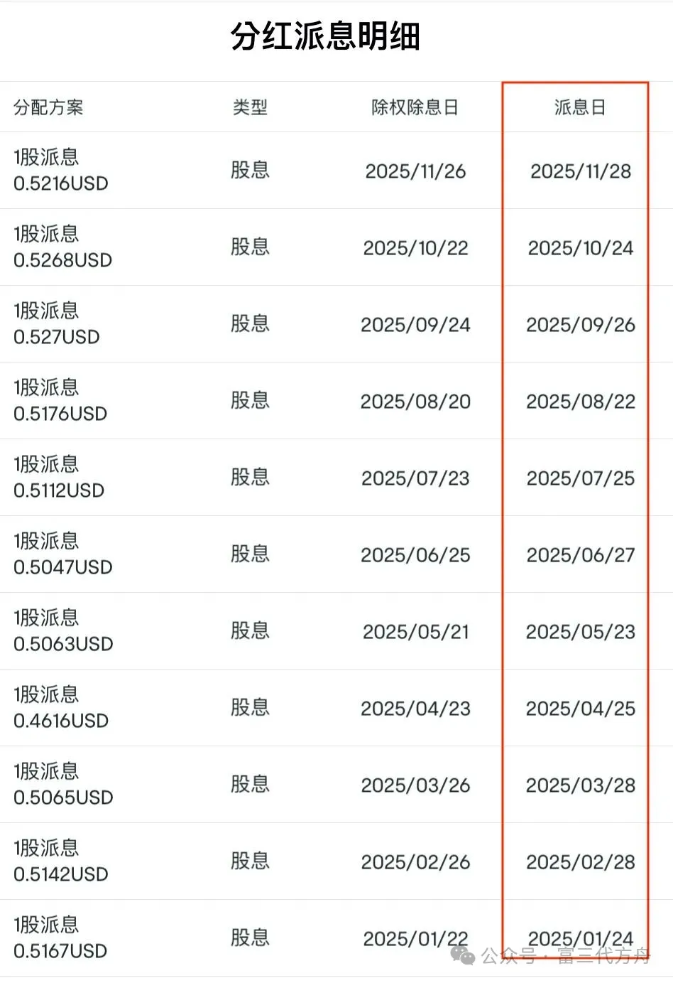 2、追踪的是标普500指数 (S&P 500 Index),该指数包含了美国500家市值最大、最具代表性的上市公司。它被广泛认为是美国大盘股和整体经济表现的晴雨表。每月派息记录,也可以每年收息。