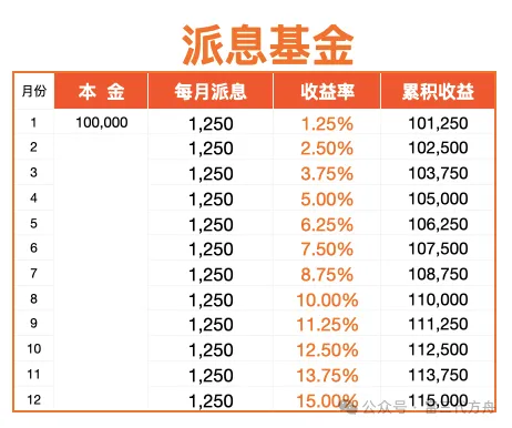 固收派息 比如说,固收类基金,每月1.25%,每年15%保证派息。固定现金流,增加睡后收入,拿去投资或消费,适合稳健投资者。10万美元投资派息基金,每月收息1,000美元,每半年7500,每年收息15,000。五年领走75,000,十年领走150,000,累积收益250%。以此类推!