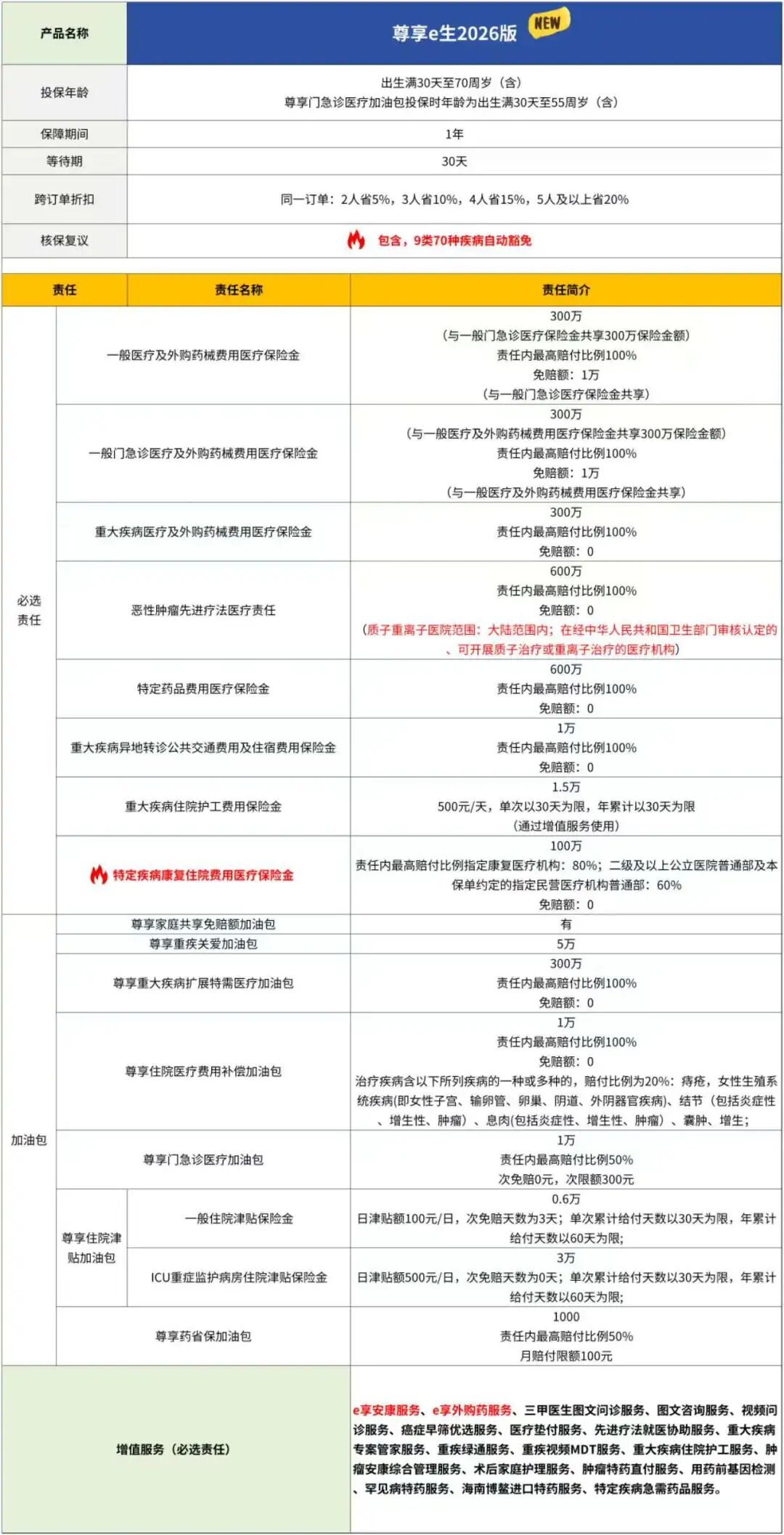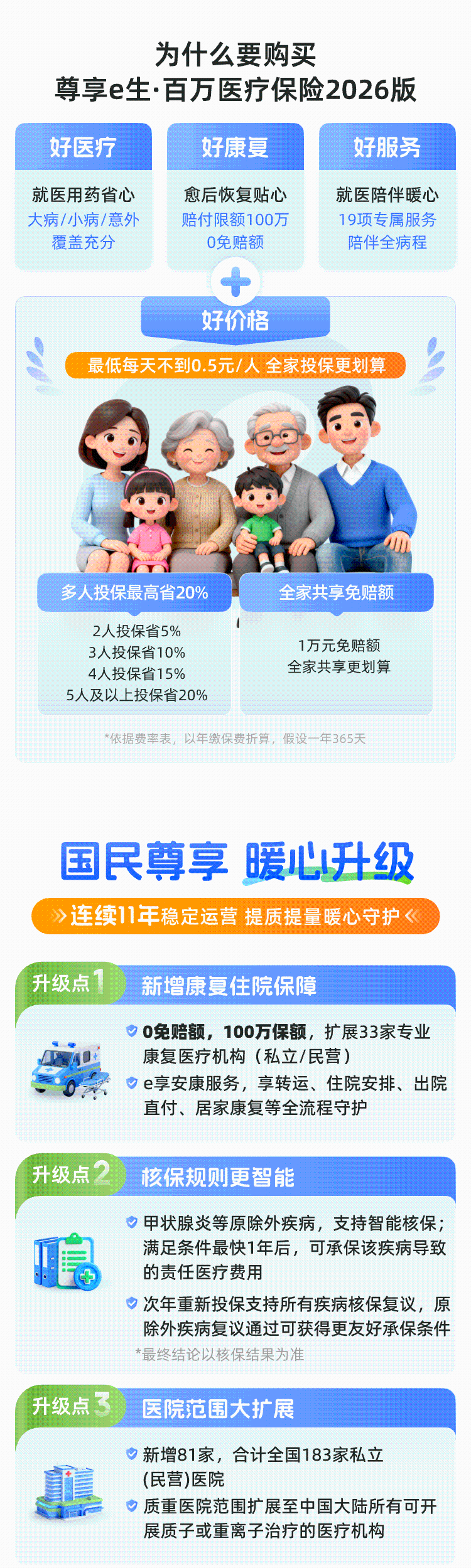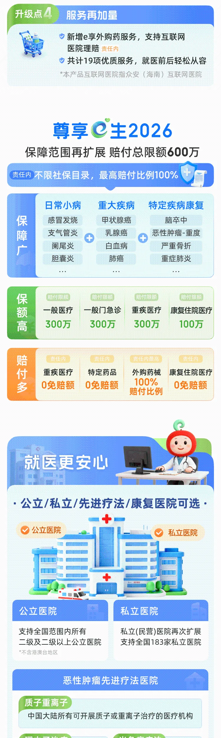★ 众安尊享e生·百万医疗保险2026版1、出生满30天~70周岁可投保; 2、特定疾病康复住院费用医疗保险金; 3、拓展183家指定民营医院、拓展32家康复医院; 4、270种特药(含6种CART)、31种罕见病药品、特种进口药品30种、指定疾病急需药品10种; 5、9类70种疾病经智能核保后有机会1年/3年标体承保★ 众安尊享e生·百万医疗保险2026版(转保专用版)1、出生满30天~70周岁可投保; 2、特定疾病康复住院费用医疗保险金; 3、拓展183家指定民营医院、拓展33家康复医院;4、270种特药(含6种CART)、31种罕见病药品、特种进口药品30种、指定疾病急需药品10种; 5、9类70种疾病经智能核保后有机会1年/3年标体承保★ 人保优享宝贝少儿中高端医疗险,可附加门急诊责任;0免赔,100%赔付;住院保障全面,保院外特药,含重疾确诊和住院津贴★ 众安成长乐·少儿医疗保险(0免赔),责任内住院和部分门诊0免赔,不限社保;50 种特定疾病特需VIP/国际部也能赔付