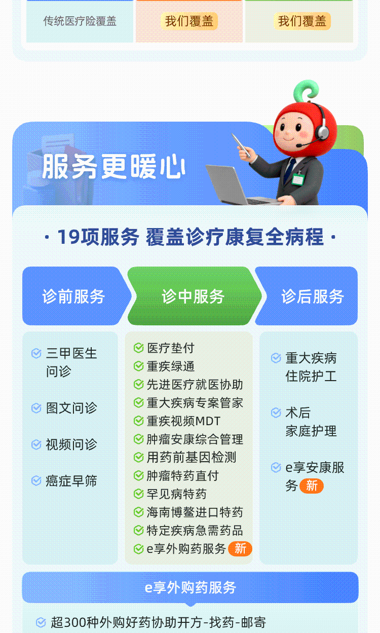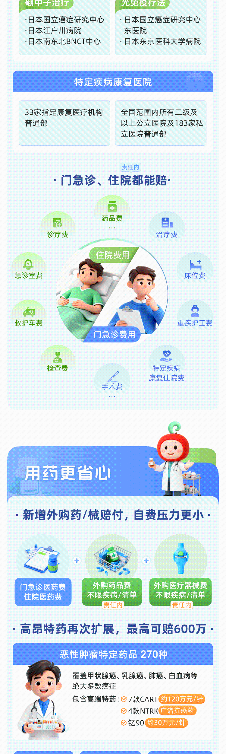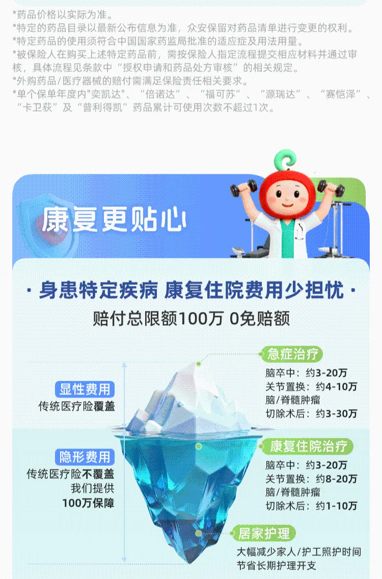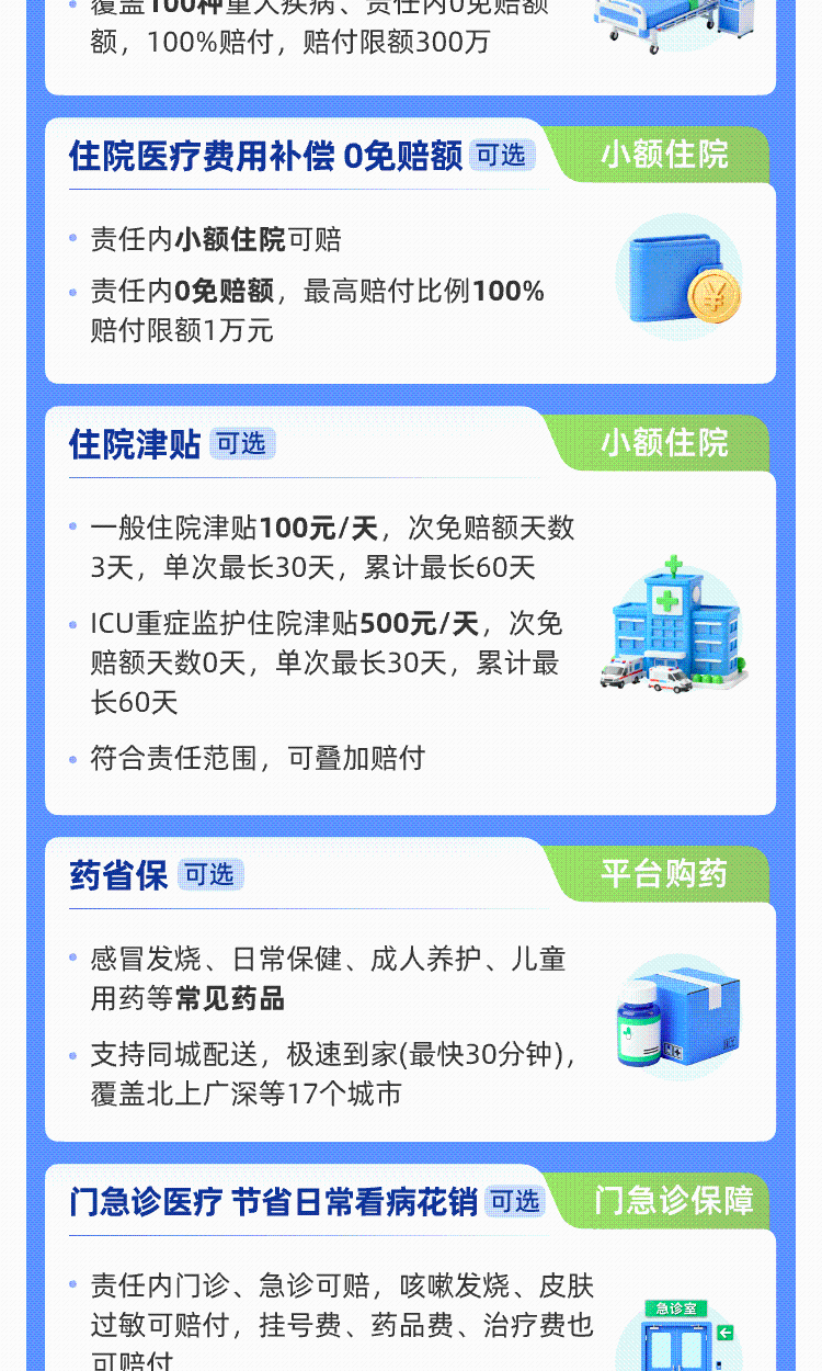 ★ 蓝医保·长期医疗险(好医好药pro版)1.整体保额提升,支持0免赔灵活勾选赔付比例; 2.特药清单新药全覆盖,拓展先行区先进药品; 3.质重医院全面放开,拓展186家民营医院; 4.加油包多样,可匹配客户多样化的需求; 5.家庭单承保可享受费率折扣;投保年龄出生满30天~70周岁(主险20年保证续保,附加险和加油包不保证续保)★蓝医保·长期医疗险(好医好药版),升级门急诊和特需医疗保障;外购药械100%赔付,进口原研,用药无忧;多家顶尖医院出院直赔★ 太平洋蓝医保长期医疗险,住院给付超贴心,保证续保20年;收入损失有保障,最长给付120个月;健康管理服务再升级,34项服务+162种特药★ 平安安欣保2.0(又名“长相安2号”)长期医疗保险(20年保证续保),加量不加价;新增指定疾病康复责任 ★ 平安e生保·百万医疗险2025, 家庭关怀:3重福利,共享免赔、共享服务、费率优惠; 肿瘤疗法:肿瘤治疗3扩充,好疗法出手可及; 特疾外购药:不限清单、不限种类,用药自由。肿瘤疗法:肿瘤治疗3扩充,好疗法出手可及; 特疾外购药:不限清单、不限种类,用药自由。★ 太平洋蓝海一生百万医疗险,0-70周岁可保;有社保保费30岁0.56元/天、55岁2.14/天;畅享500万海外先进医疗保障★ 利宝安康无忧百万医疗险2023; 1. 30天-65周岁均可投保; 2. 0免赔额,住院报销1元起赔;对于您的自付金额低于 1 万元部分,计划一和计划三赔付比例 50%,计划二和计划四赔付比例为 100%。超过 1 万元部分,赔付比例 100%。如确诊本产品约定的 120 种重大疾病,赔付比例为 100%;3. 靶向药直付(含进口靶向药)。★ 太医保·百万医疗,经典版性价比高,尊享版0免赔,1万以下50%赔付; 恶性肿瘤先进疗法医疗保险金;可选重大疾病医疗拓展特需医疗★ 蓝医保·住院医疗险,关爱版无健康告知,既往症也可赔付;可享受税收优惠;3年保证续保;家庭单优惠,至高优惠10%★ 泰康全人群百万医疗保险1、保障总额600万 2、慢病人群、患者人群均可投保,符合条件有机会标体承保 3、含专属体检、泰康权益等特色增值服务★ 平安乐享百万医疗险 1、30天-70周岁可投保; 2、含重疾确诊保险金和重疾住院津贴; 3、含恶性肿瘤特药基因检测费用★ 中银医无忧百万医疗险,社保内外都能报;30天-60周岁均可保,续保至100岁;保障责任全,高额治疗费用均包含