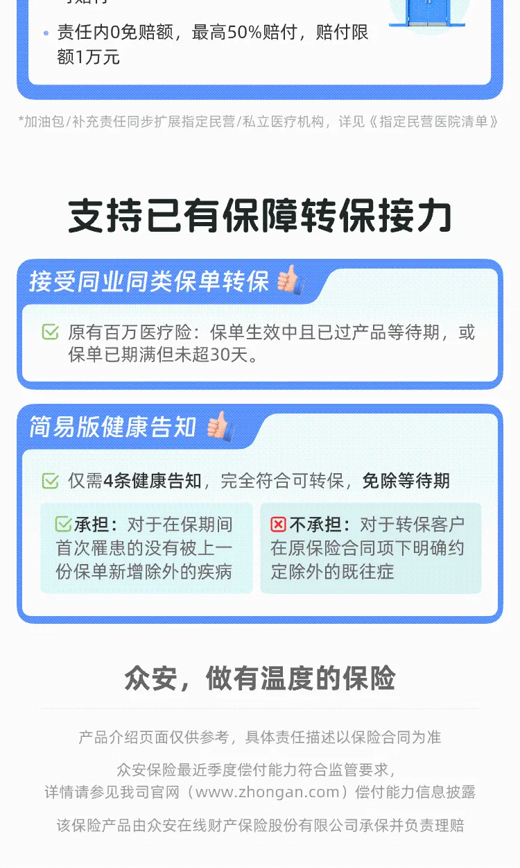 ★ 平安1+1住院医疗保险2019版,百万医疗黄金搭档,满足日常医疗报销; 意外和疾病住院均0免赔★ 众安住院保2024 : 1:0免赔额百万医疗好搭档2:住院医疗不限社保目录3:赔付门槛低,赔付范围广