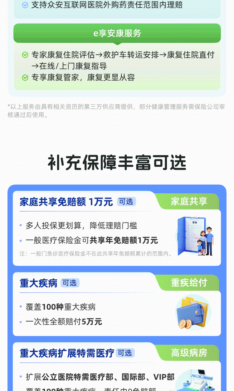 中端医疗险★ 众安尊享e生·中高端医疗保险2025版 1、0/5000元免赔额可选,责任内赔付比例最高100%; 2、核保更宽松,支持预核保/智核及核保复议; 3、健康异常别担心,符合健告,既往症友好、责任内满三年可赔; 4、放开民营医院限制,特药不限清单,不限质重范围(责任内); 5、支持儿童单独投保,家庭投保更划算,保费最高省20%。★ 众安尊享e生·中高端医疗保险PLUS(2025版)1、支持直付,责任内可选0免赔额; 2、相对免赔额:刷社保卡费用可抵扣免赔额; 3、拓展境外医疗:重疾就医可赴港/日/美指定合作医院; 4、家庭版更划算:家庭共享免赔额,保费最高省10%。★ 众安尊享e生·中高端医疗保险2025版(转保专用版)1、0/5000元免赔额可选,责任内赔付比例最高100%; 2、就诊医院范围扩展至二级及二级以上医保定点医疗机构; 3、责任内,质重医院范围不限清单,外购药/械、恶性肿瘤--重度及罕见病特药不限清单; 4、转保更宽松、既往症满三年可保。★ 众安尊享e生·中高端医疗保险PLUS(2025版)(转保专用版)1、普通部0免赔额,特需部0/1.5万/3万免赔额可选,任意搭配; 2、责任内,一般住院享私立/昂贵医院,特病扩展香港/日本/美国指定私立医院; 3、责任内,原研/进口药、罕见病药、院外特定药品不限清单; 4、转保更宽松、既往症友好。★安盛天平卓越馨选医疗保险(2025版) 1. 保障责任广,累计最高赔付600万; 2. 6大计划灵活选择,可根据风险偏好、就医需求、保障预算选择不同计划和加项包; 3. 支持家庭单,2人95折,3人及以上9折。★ 安盛天平卓越馨选医疗保险2024版,一般住院医疗保额最高提升至300万,新增住院外购药品费责任,特药清单拓展至128种