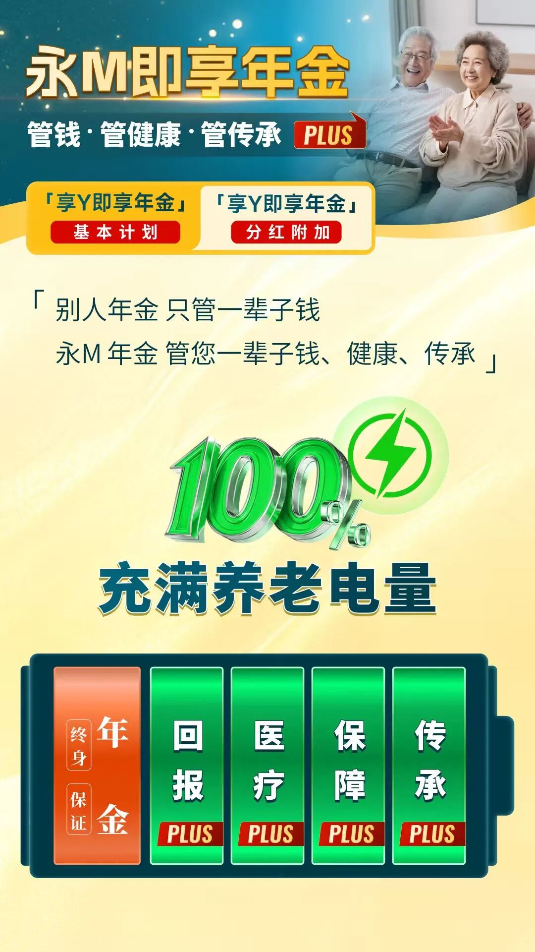结语一份真正成熟的养老方案,不只是派息多少,而是能否覆盖退休阶段的现实需求。现金流要稳定,健康资源要跟上,风险要有保障,财富还要能够延续。「享Y即享」+「享Y添心」终身年金PLUS,将钱、健康与传承纳入同一张保单架构之中,构建完整养老系统。在利率走低与人口老龄化趋势加速的背景下,提前搭建可持续现金流与健康支持体系,比单纯追逐收益更具战略意义。真正的养老规划,是在今天把未来的确定性锁定。这,或许才是“PLUS”的真正含义。