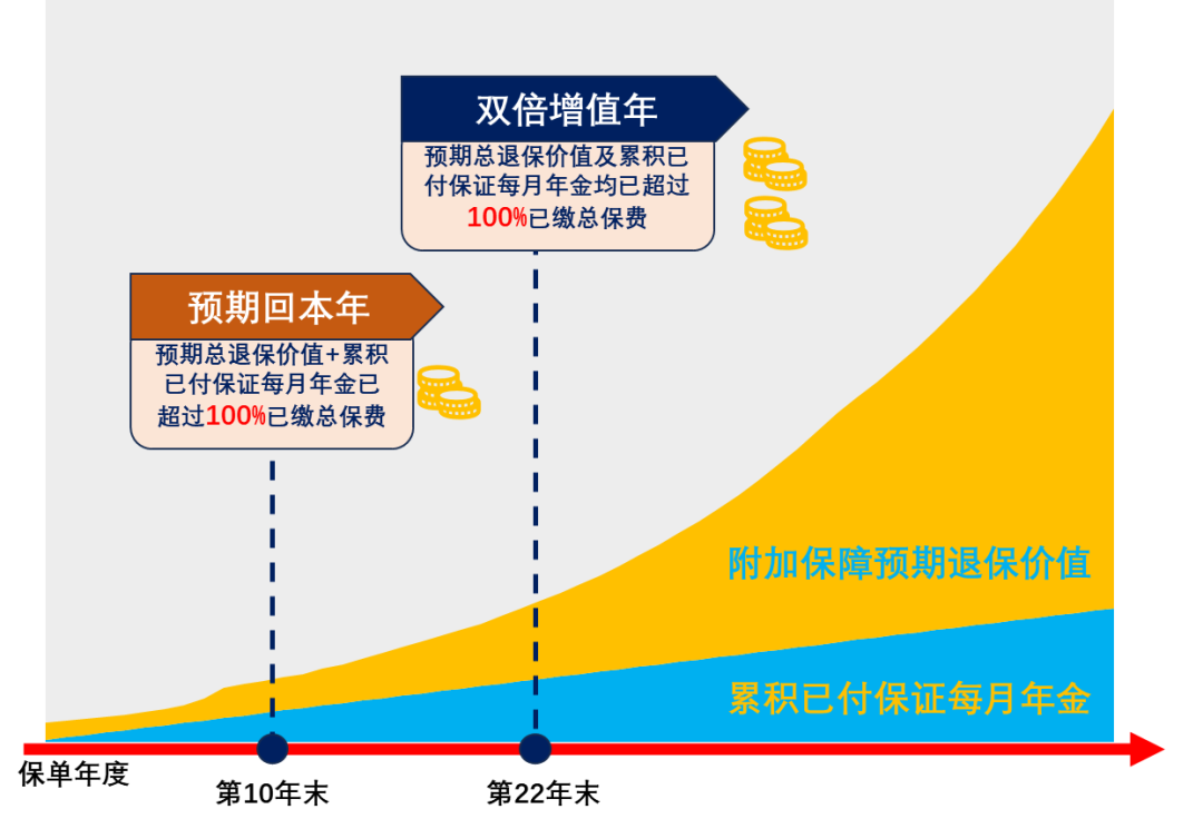 第10年末,已派年金与剩余现金价值实现回本;第22年末,已派金额与剩余价值实现翻倍;之后年金持续派发,附加险红利继续增长。