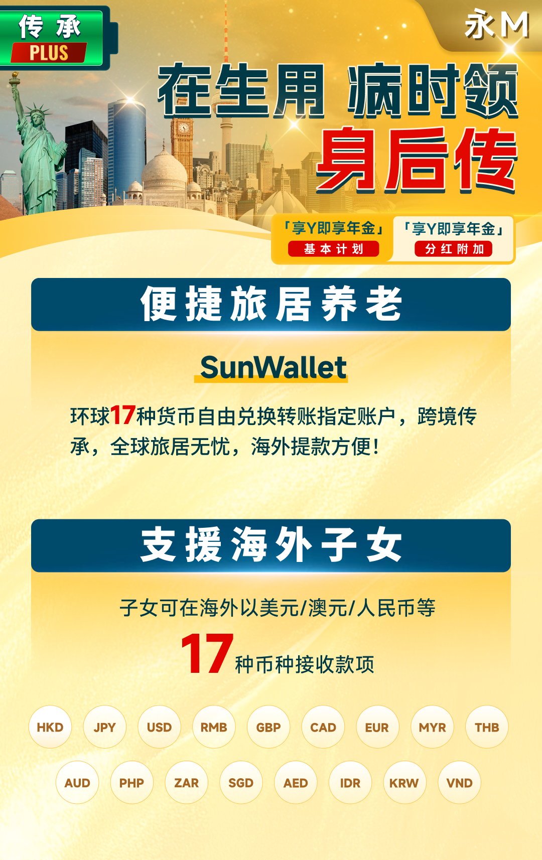 07传承安排:在生可用,身后可传不同于传统年金只解决个人阶段性现金流问题,该方案支持更换受保人及保单延续安排,使年金派发可跨代延续。配合SunWallet工具,可实现多币种划转与跨境支付支持,便于海外旅居养老或对子女进行资金支援。一张保单,可以同时满足两代人的现金流规划与资产延续需求。