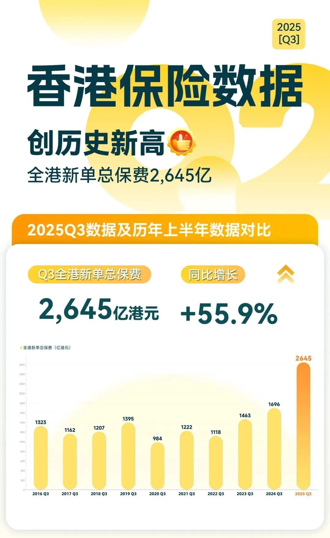 日前,香港保监局公布2025年首三季临时统计数字,期内毛保费总额6370亿港元,上升32.5%。长期业务(不包括退休计划业务)的新造保单保费为2645亿港元,升55.9%。