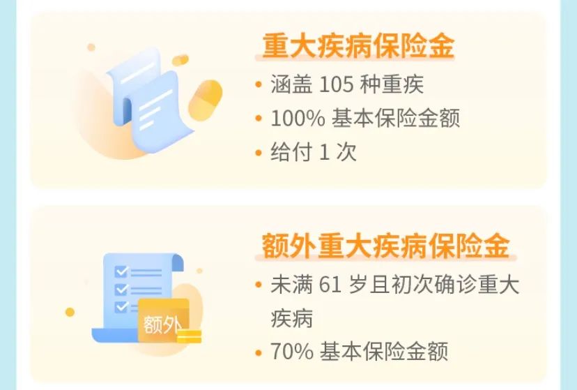 重疾:保105种疾病,赔1次,赔付100%基本保额(61岁前额外多赔70%基本保额。)