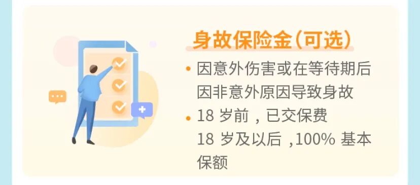 身故保障:18岁前返还保费,18岁后赔付基本保额; 特疾二次赔:癌症+2种心血管特疾(急性心肌梗塞/冠脉搭桥术)二次赔,额外赔付120%基本保额,各1次 首次重疾为癌症:确诊癌症复发、转移或持续,间隔3年;确诊新发癌症,间隔180天; 首次重疾为特疾:确诊同种疾病,间隔3年; 首次重疾非癌症/特疾,间隔180天。