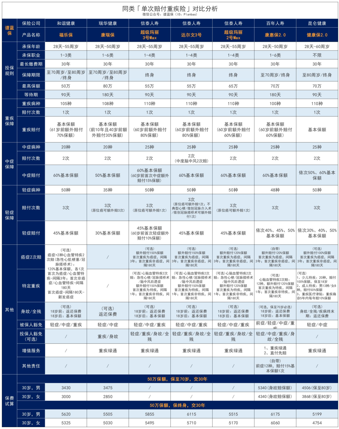 预算有限,追求性价比:福乐保、康瑞保,保至70岁;超级玛丽2号max,保终身,费率最低; 基本保障充足:超级玛丽3号max,轻中症、重疾赔付条件好。健康保2.0,基础保障全面,投保规则宽松,保费便宜;这两款适合大多数女性。 注重心脑血管疾病保障:达尔文3号、康惠保2.0。达尔文3号高发轻中症允许2次赔;康惠保首创前症保障;这两款适合大多数男性。 高危职业:健康保2.0、康瑞保。健康保2.0不限职业可投,康瑞保1-6类职业可投。