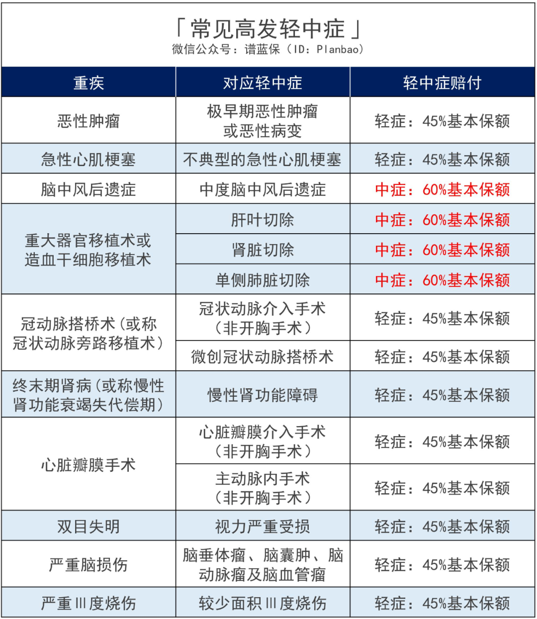 中症:20种,赔2次,每次赔付60%基本保额; 轻症:50种,赔3次,每次赔付45%基本保额;